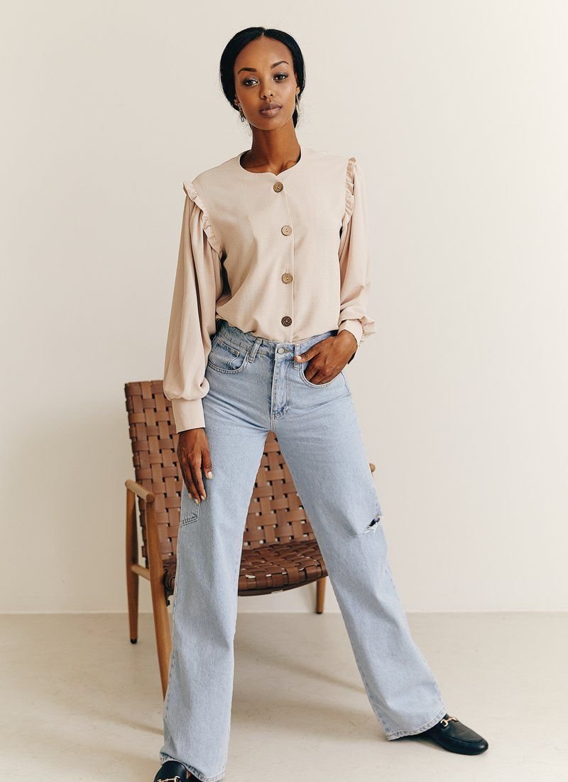 Blouse of a straight cut with a round neck on buttons stylized as wood. The long sleeve at the base is decorated with a thin neat frill, with wide cuffs. This blouse will go perfectly with both trousers and jeans.