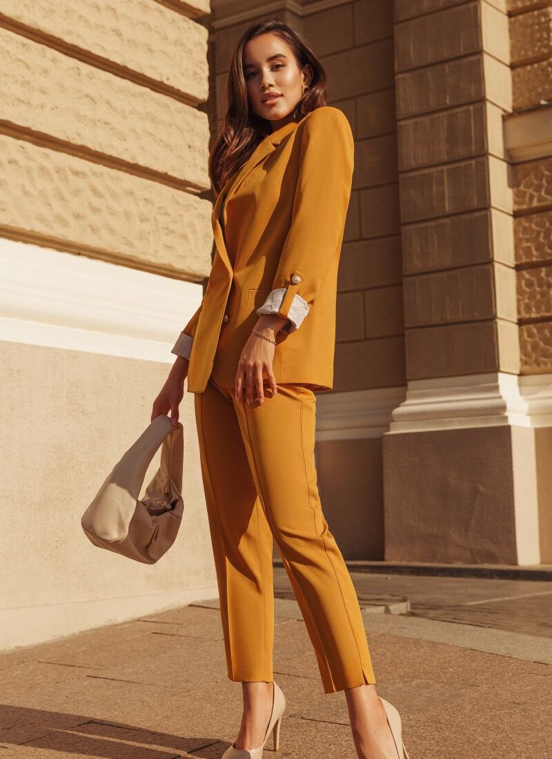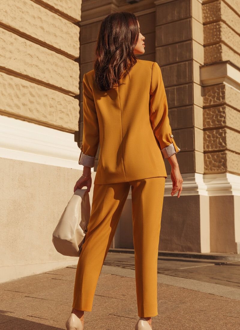 Trendy pantsuit: blazer with a turn-down collar, pointed lapels with a removable brooch, modeling foam inserts on the shoulders, long sleeves with a patch closure and dummy pockets, 7/8 straight trousers with a high fit, pinches, two welt pockets on the sides and dummy pockets on the back.