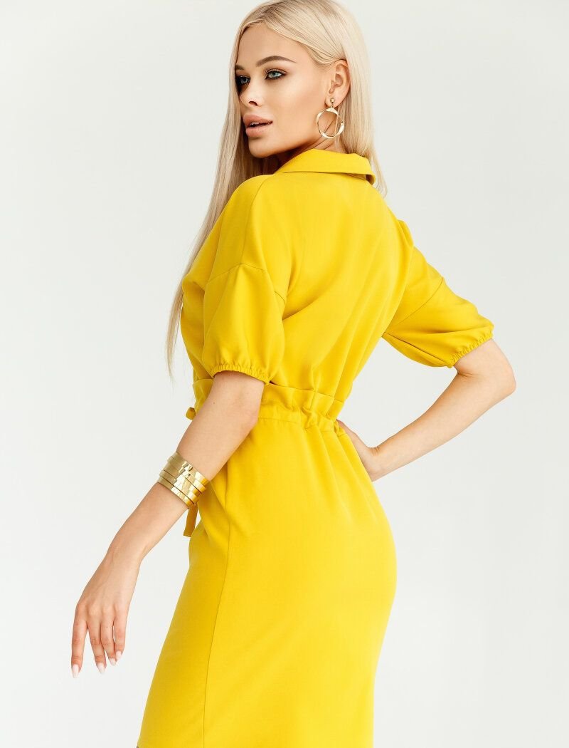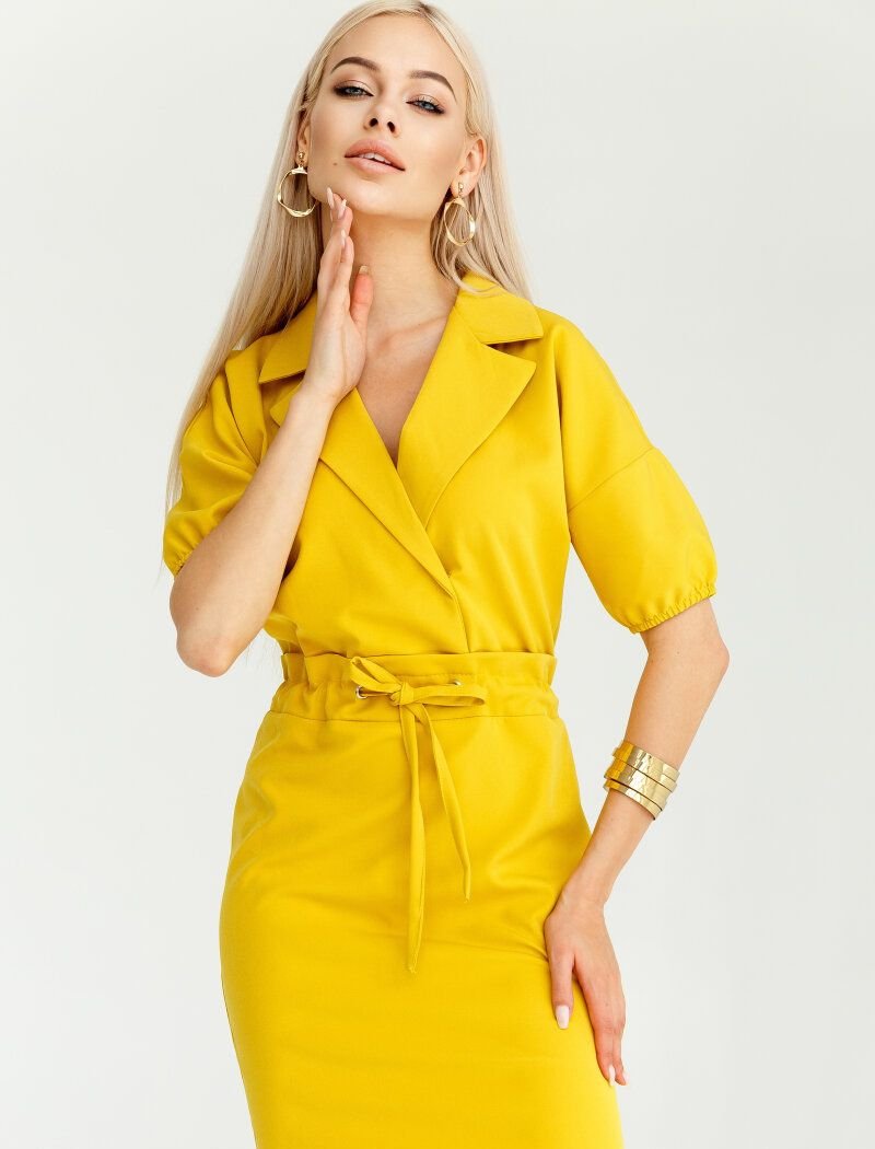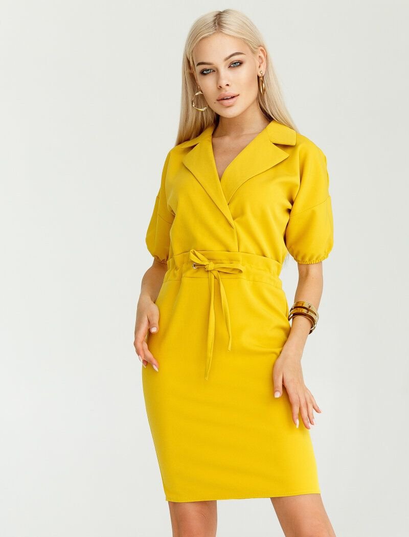 A dress in a business style, complemented by details. Turn-down collar with lapels, deep v-neck. Short voluminous sleeves with an elastic insert. A tie-in belt with ties and a short tight skirt.