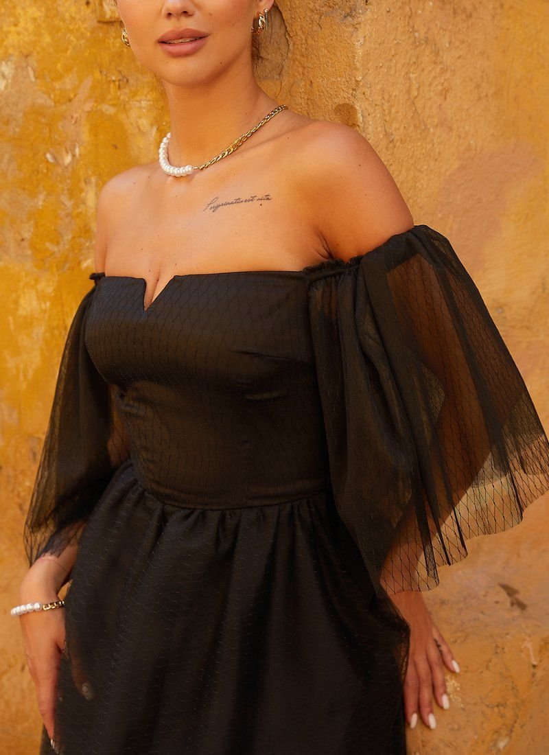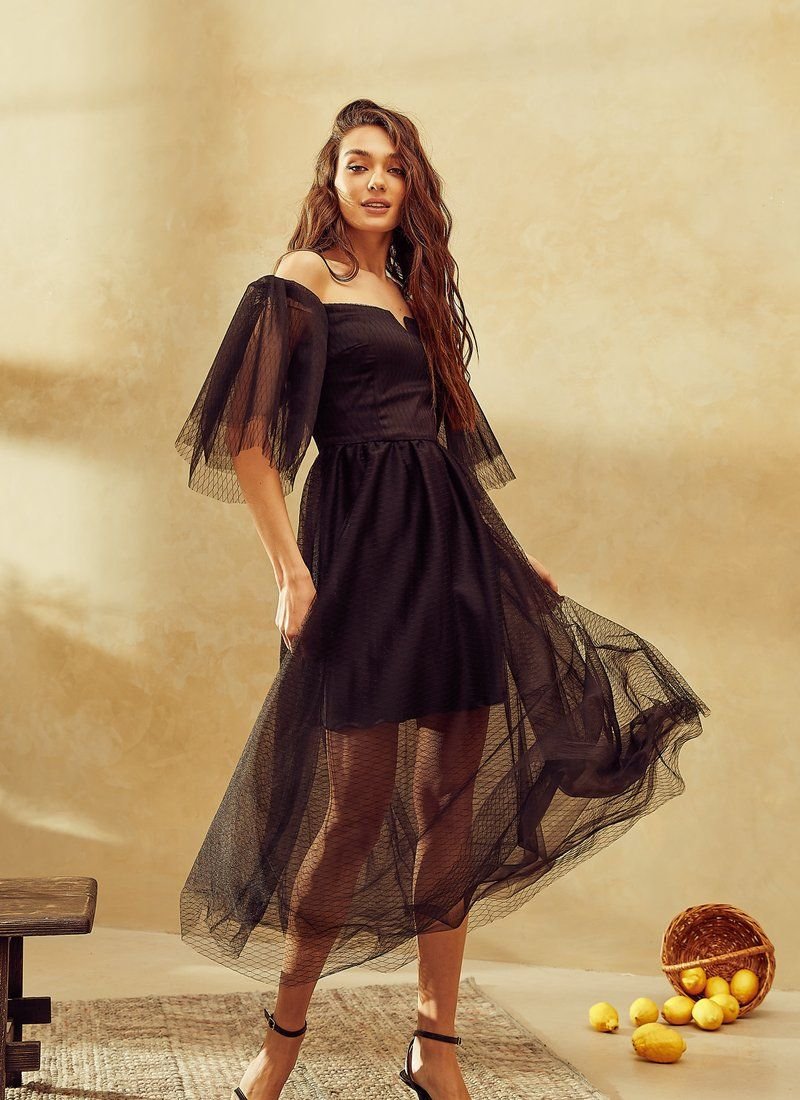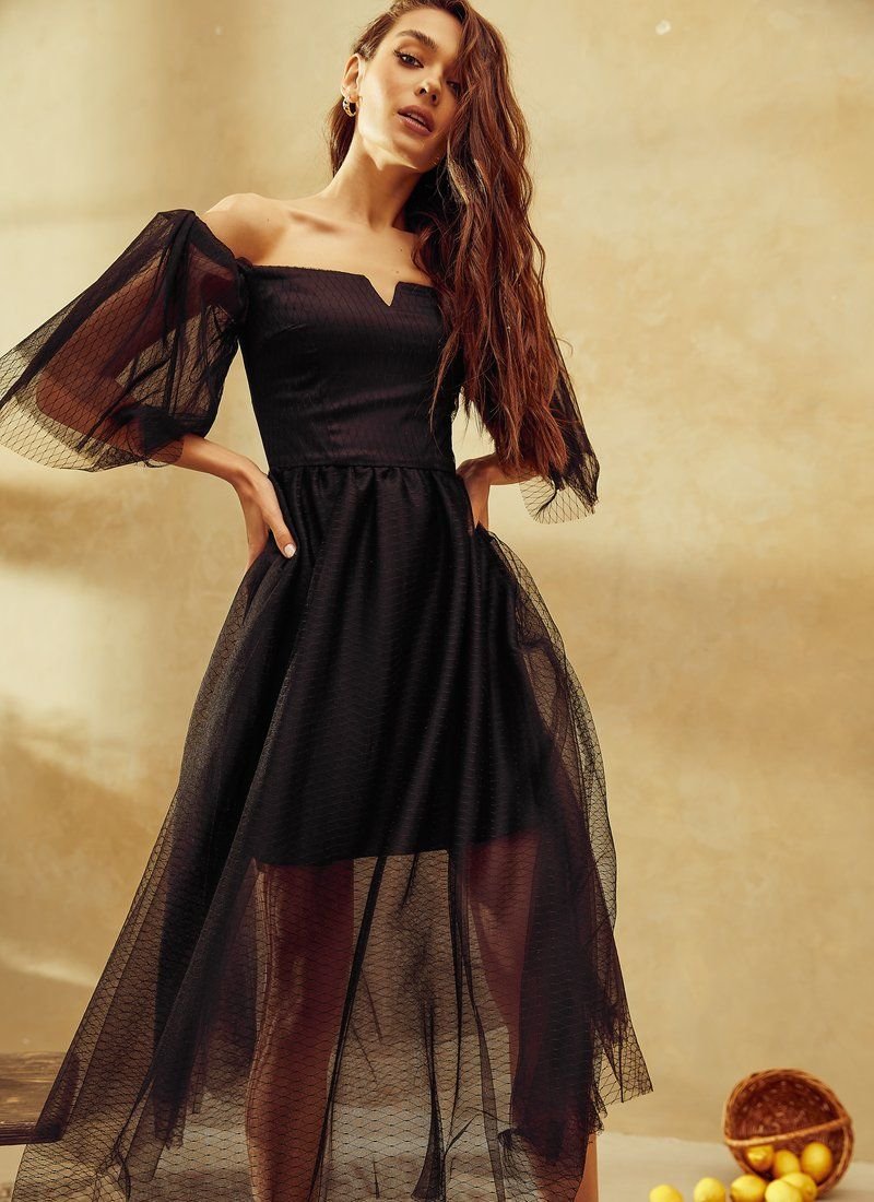 Such a detail as the lowered shoulder line is a fashionable technique of the evening look in the SS’21 season. A black fitted dress from Gepur designers will emphasize feminine fragility and grace, without forgetting about sensuality. The base of sliding silk was decorated with a double layer of airy mesh material with a flock coating in peas. The decollete area was emphasized with a curly neckline.