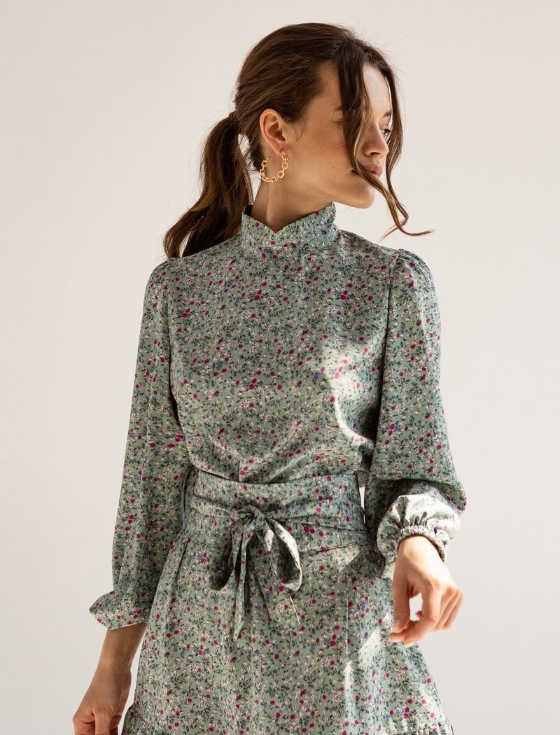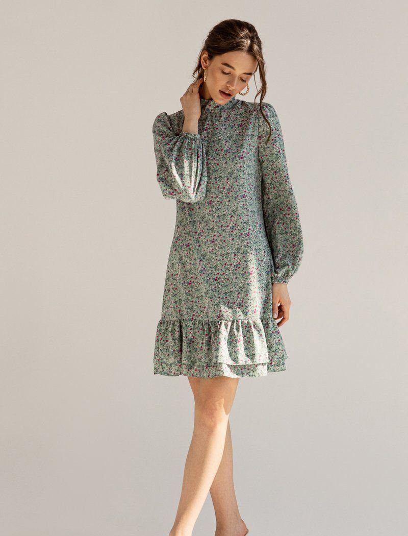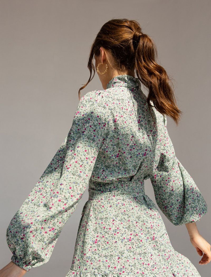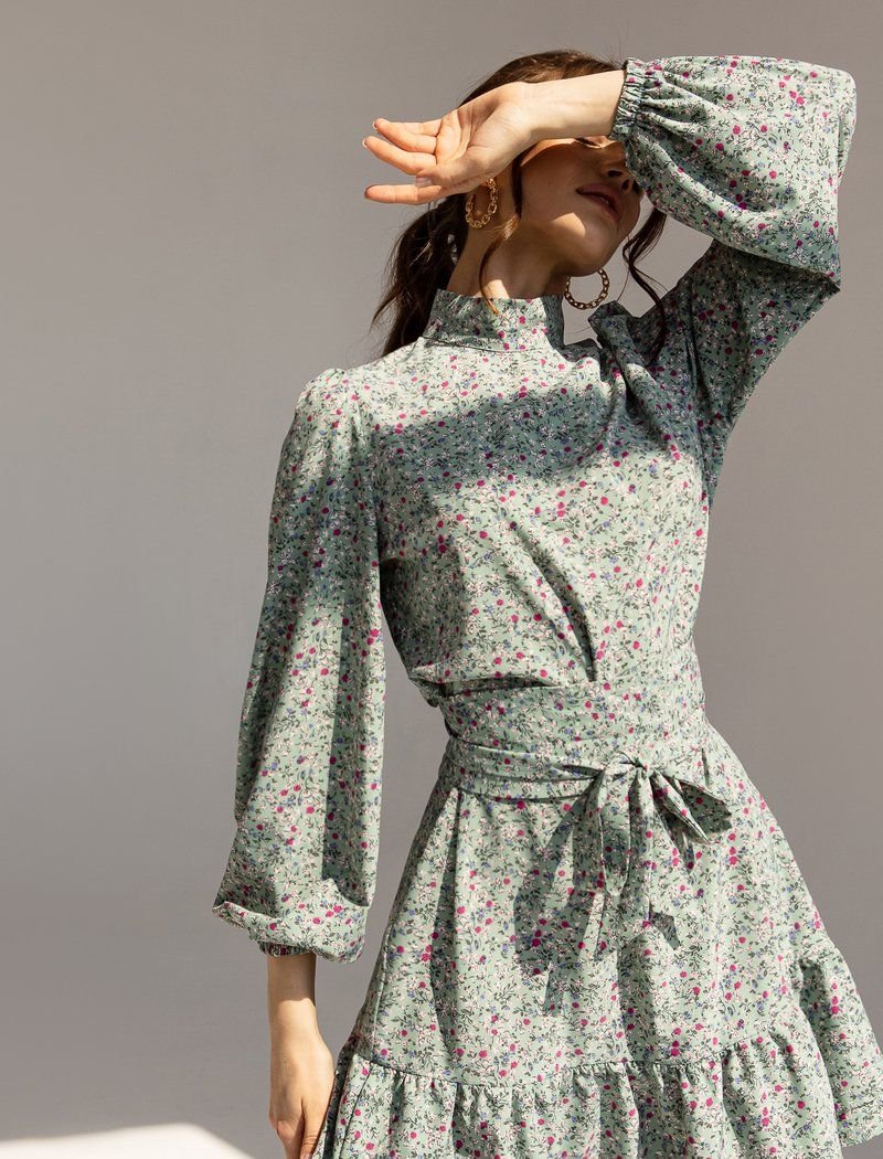 The mini dress in a muted green shade is made of a light fabric that is best suited for warm weather. The model is complemented by a two-layer flounce at the hem, a stand-up collar and voluminous sleeves in the spirit of the SS21 Balmain and Balenciaga shows. The belt allows you to make the silhouette fitted.