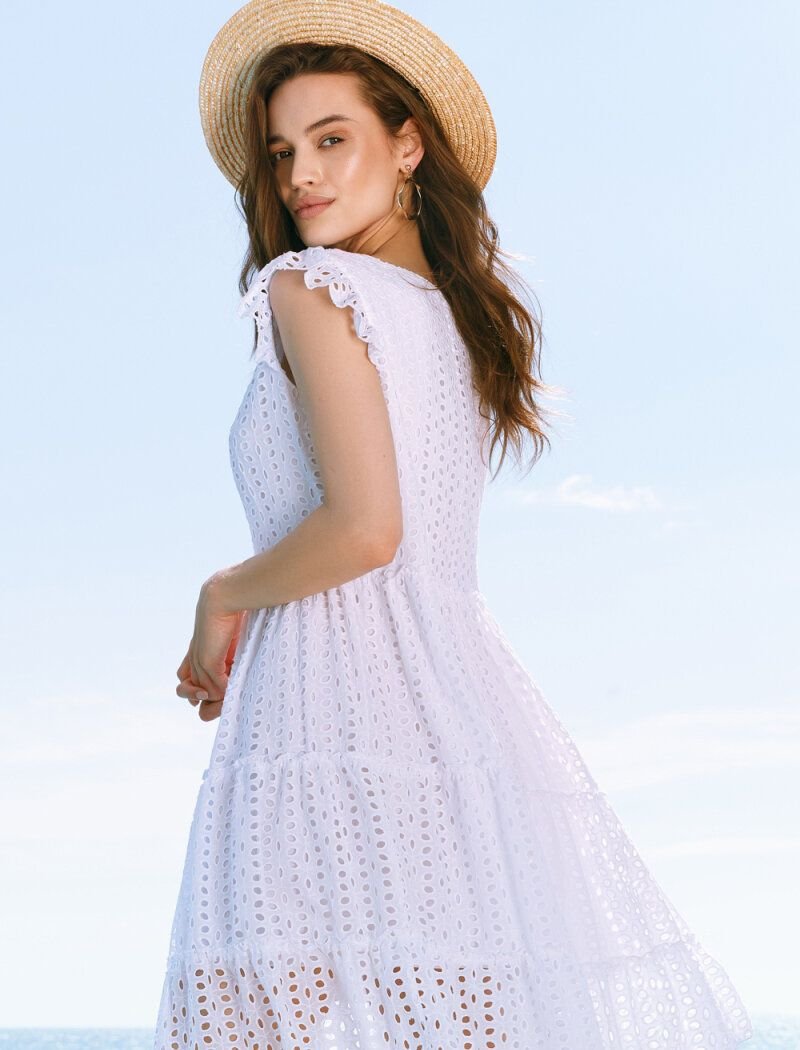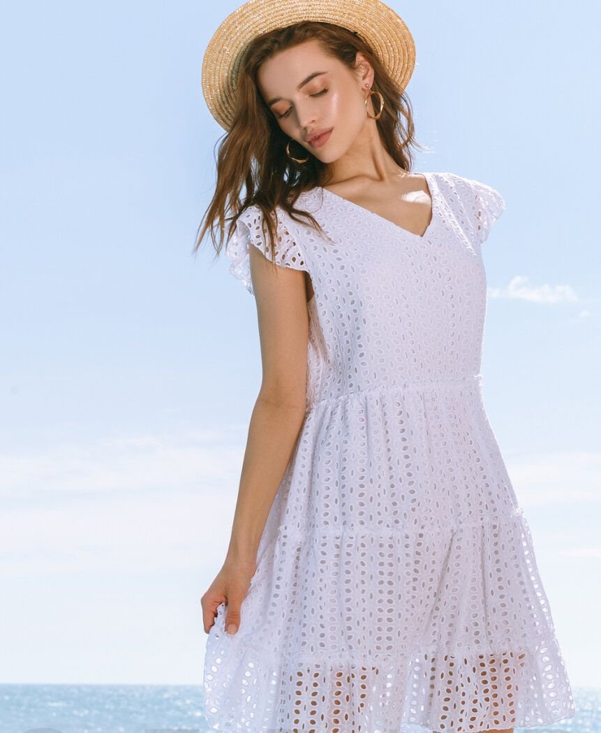 A flirty white a-line dress with openwork embroidery. A deep v-shaped neckline, flounces on the sleeves, a cut-off waist and a multi-tiered skirt with a cotton lining.