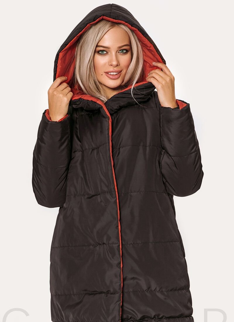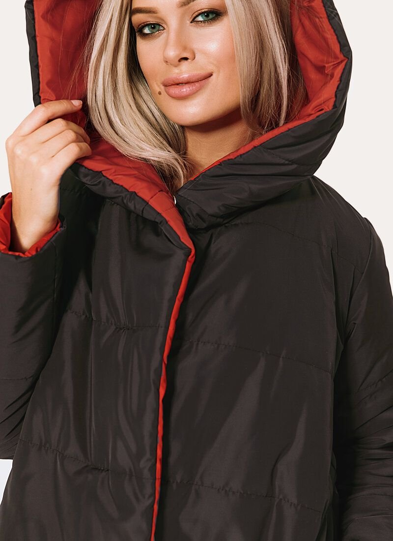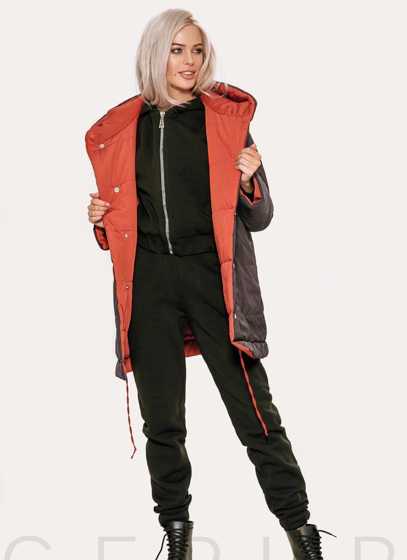 A two-sided voluminous jacket in a trendy color: a non-detachable hood, a long sleeve, a strap with metal buttons in the front and a drawstring hem.Features: additional insulation - sintepon (200 g /m2). Please note that the product is designed for temperatures up to -10 °C.