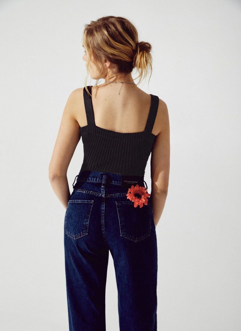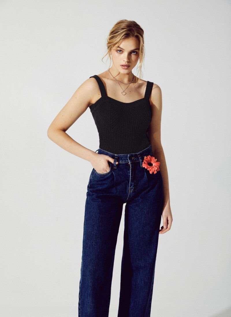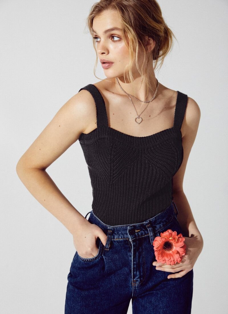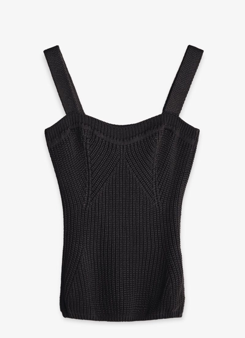 The black T-shirt is made of textured knitted material. The model is complemented by a curly neckline in the spirit of the SS?21 Givenchy and Alberta Ferretti shows and is perfect for multi-layered images.