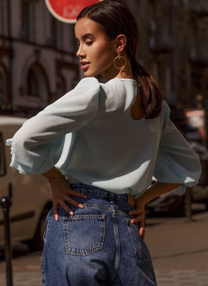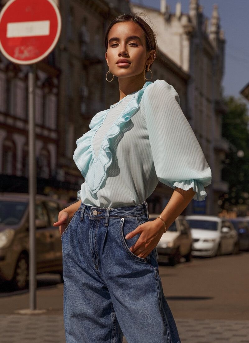 Airy blouse in blue with trendy voluminous sleeves. The front of the blouse is decorated with double ruffles to match. The 3/4 voluminous sleeve has an elastic insert and ruffles. There is a small teardrop-shaped neckline at the back, complemented by a button closure.