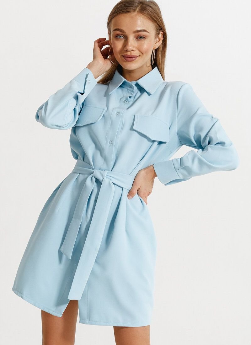 A shirt dress of delicate blue color with a turn-down collar, a long sleeve with a patch closure, chest pockets, two pockets in the seams and a removable belt to match.