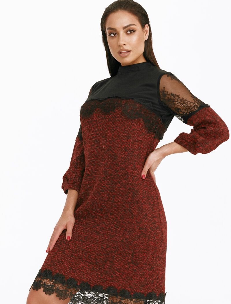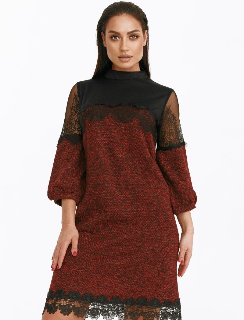 An elegant mini dress with a neat stand-up collar, a 7/8-length sleeve with lace inserts, complemented by a removable brooch.