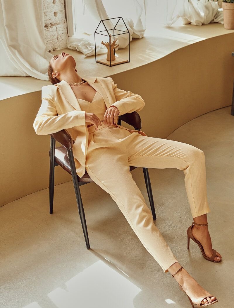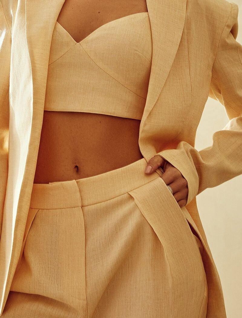 Yellow trousers can fit not only in the resort, but also in the everyday wardrobe. The secret of their versatility is in a laconic narrowed silhouette and light artificial linen. The cropped cut emphasizes the ankles, and the pinches on the belt emphasize the waist.