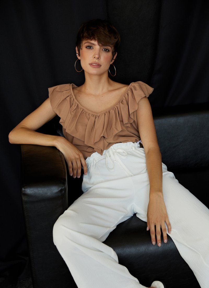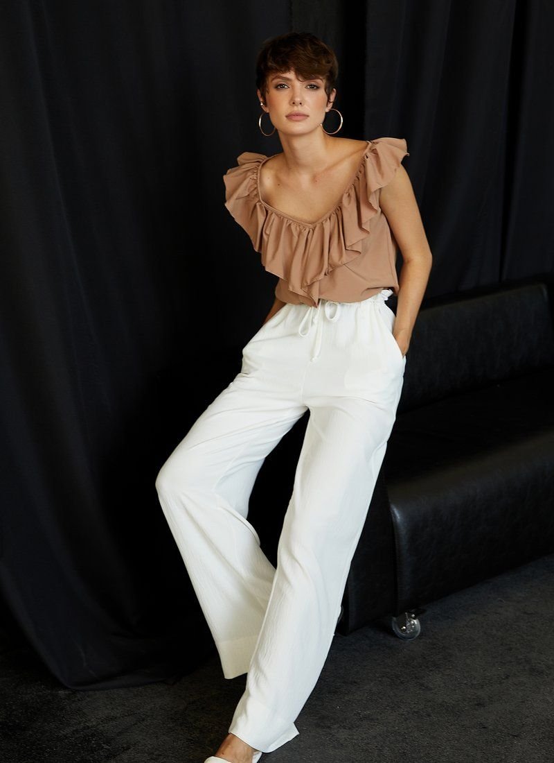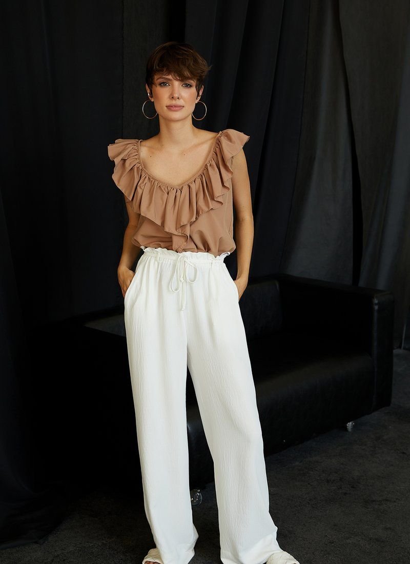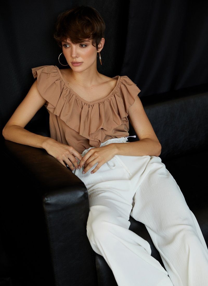 A beautiful beige blouse without sleeves, a loose cut with a v-neck, which is decorated with voluminous ruffles. Perfect for everyday looks, and can also complement an outfit for an evening out.