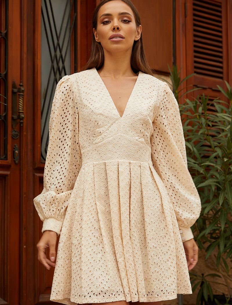 Beige fitted mini dress does not tolerate competition. Due to the complex texture of the translucent material with embroidery, he needs a minimum of jewelry in the company: you can limit yourself to a clutch and matching shoes. To make the model show and hide equally, it was supplemented with a lining. The accent details were voluminous sleeves in the spirit of the SS21 Bottega Veneta and Balenciaga shows.