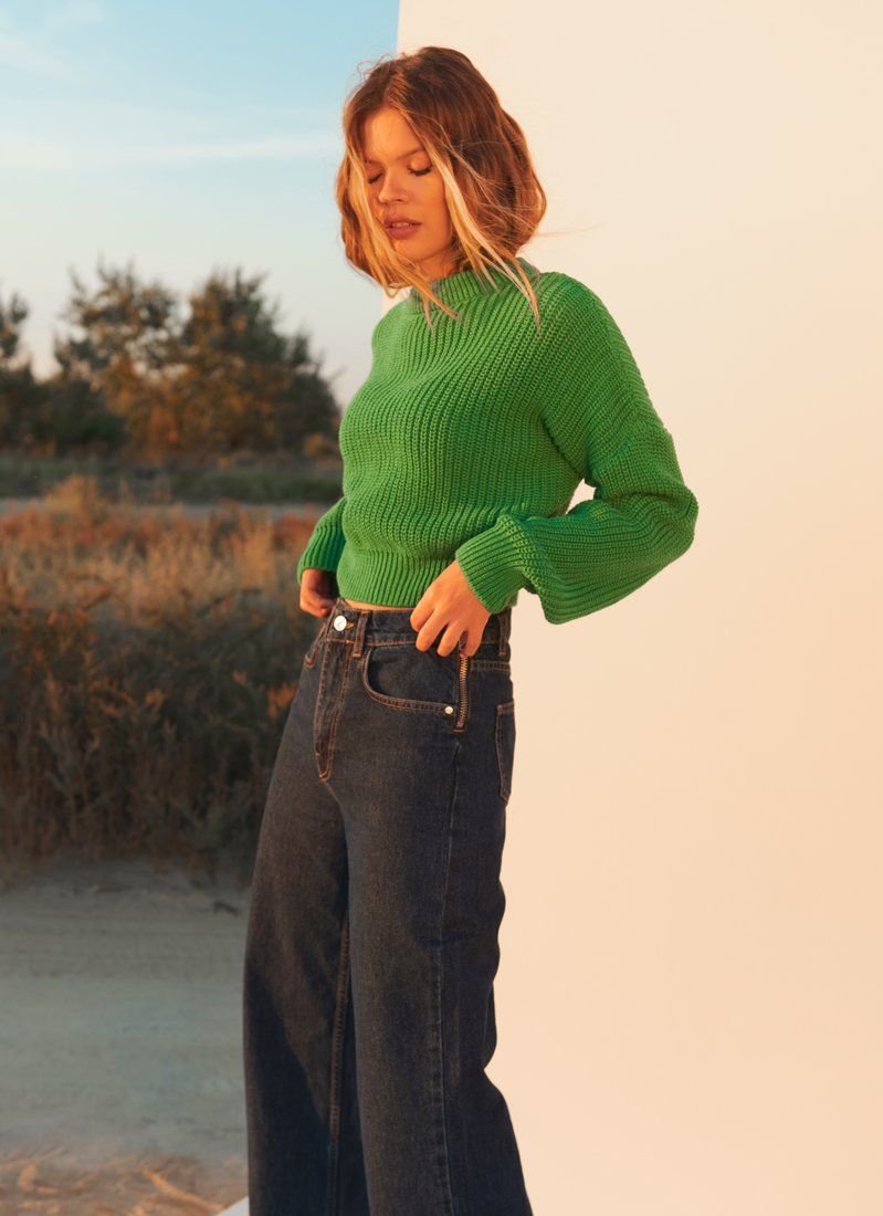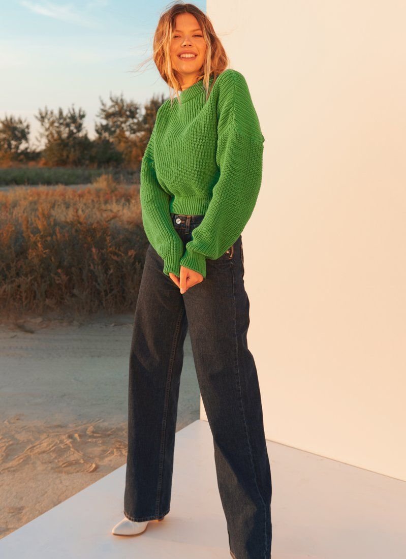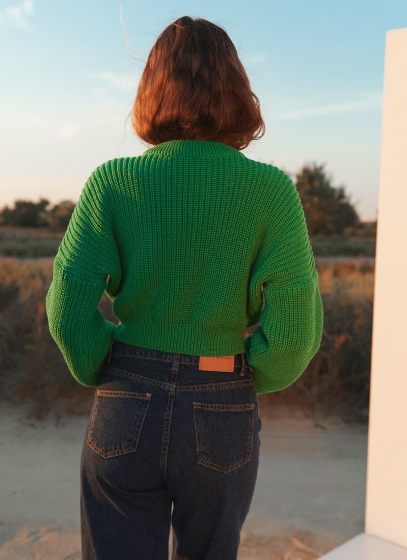 The Pantone Color Institute highlights green as one of the main colors of the year, and continues to be trending in the FW 2021/22 season. A short-cut jumper with long sleeves, a deflated shoulder line.