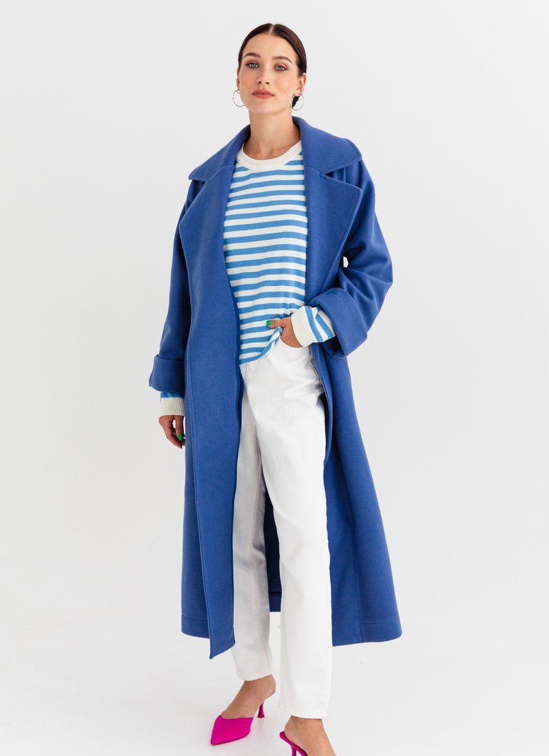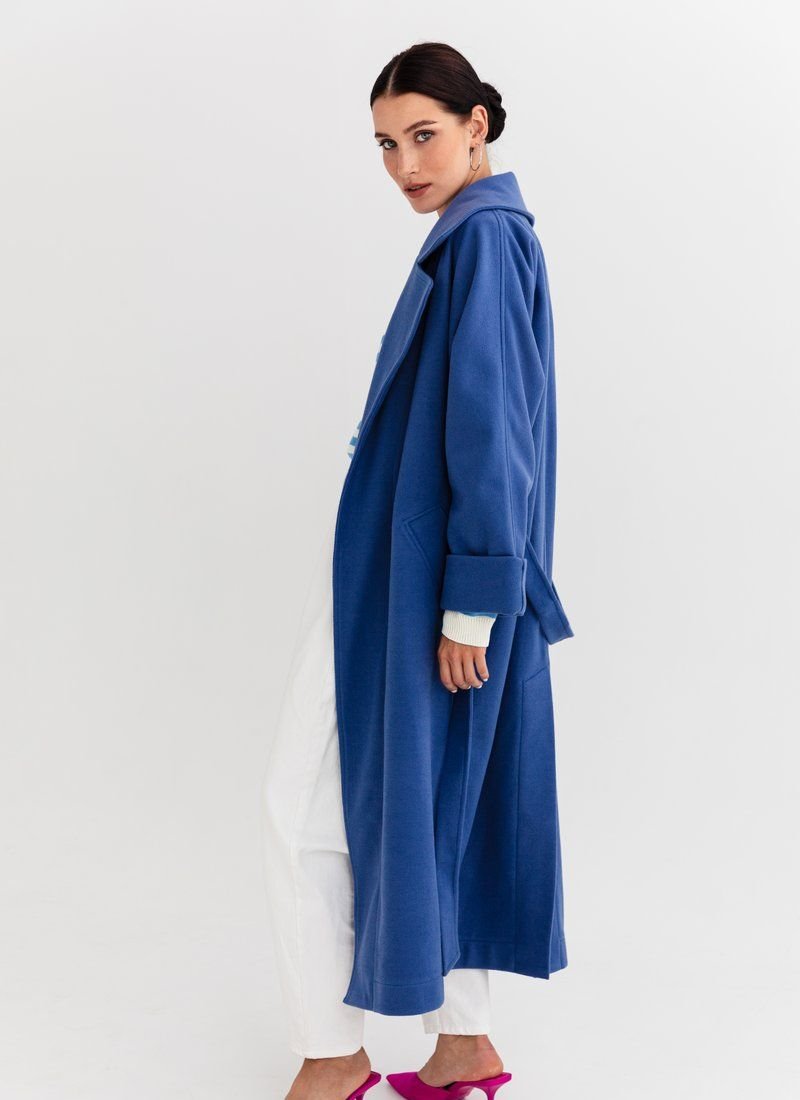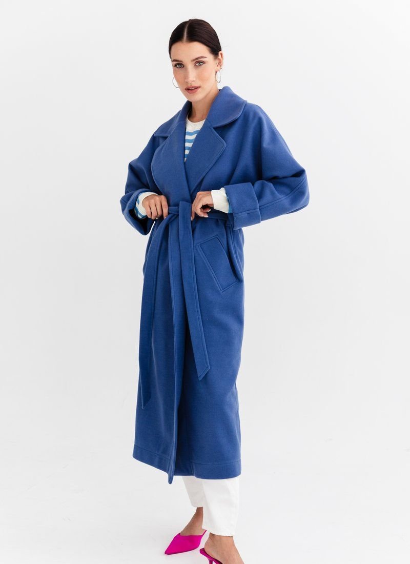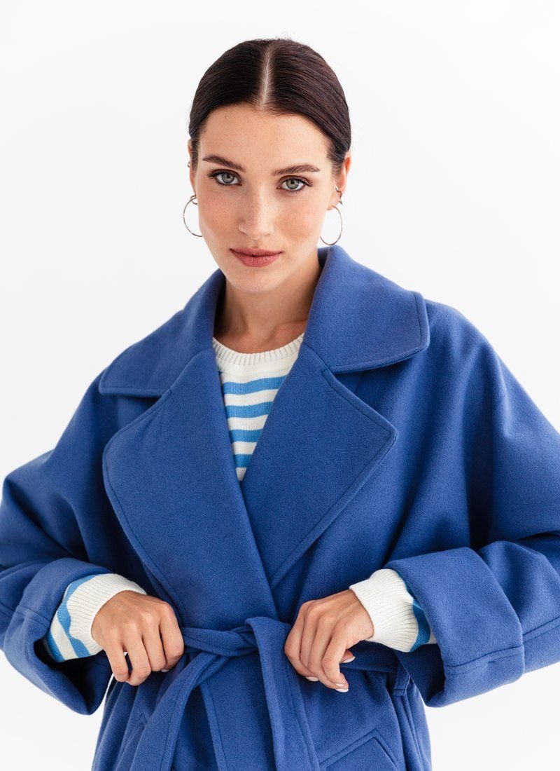 A spectacular demi-season coat without lining, made of soft cashmere fabric. A classic cut model with a turn-down collar, lapels and a voluminous sleeve with a fixed lapel. There are two welt pockets on the sides, a slit-slot and a removable belt-ribbon to match.