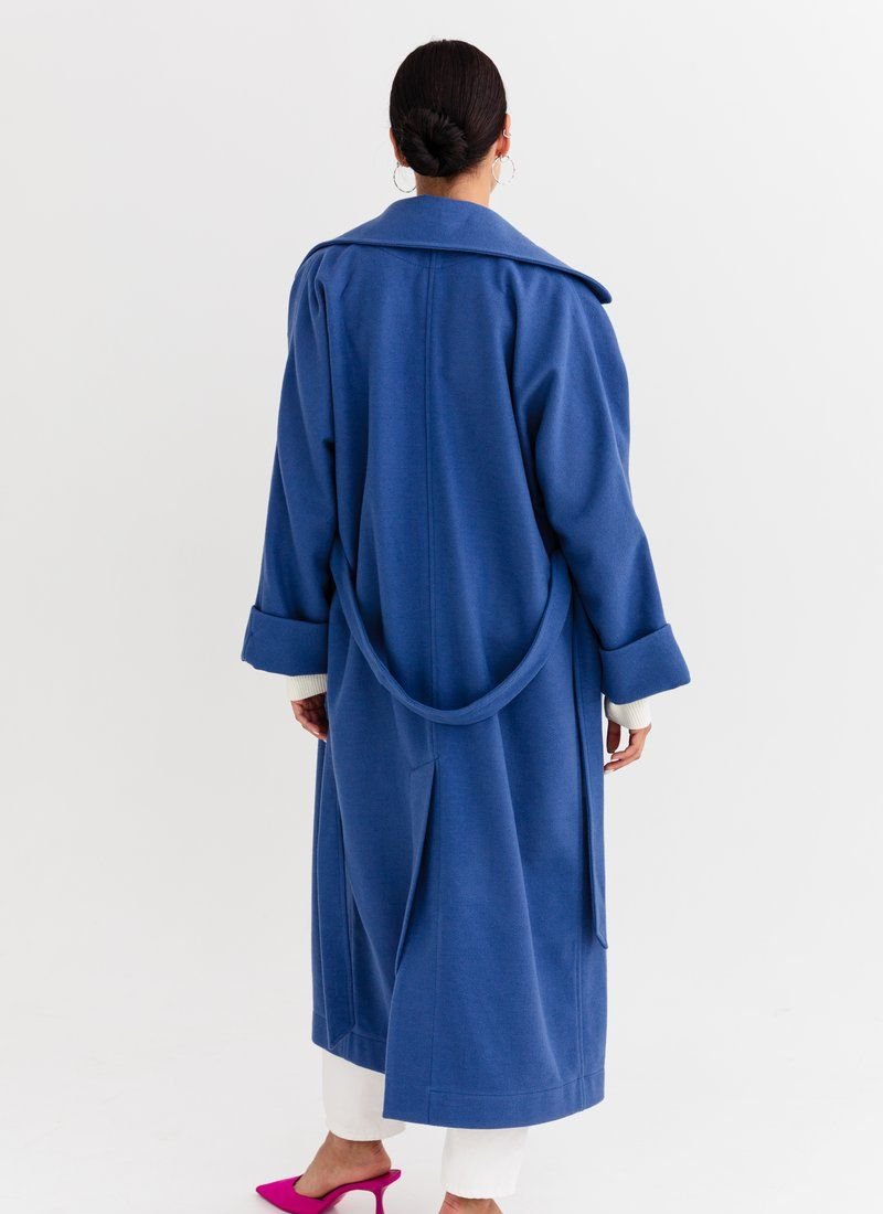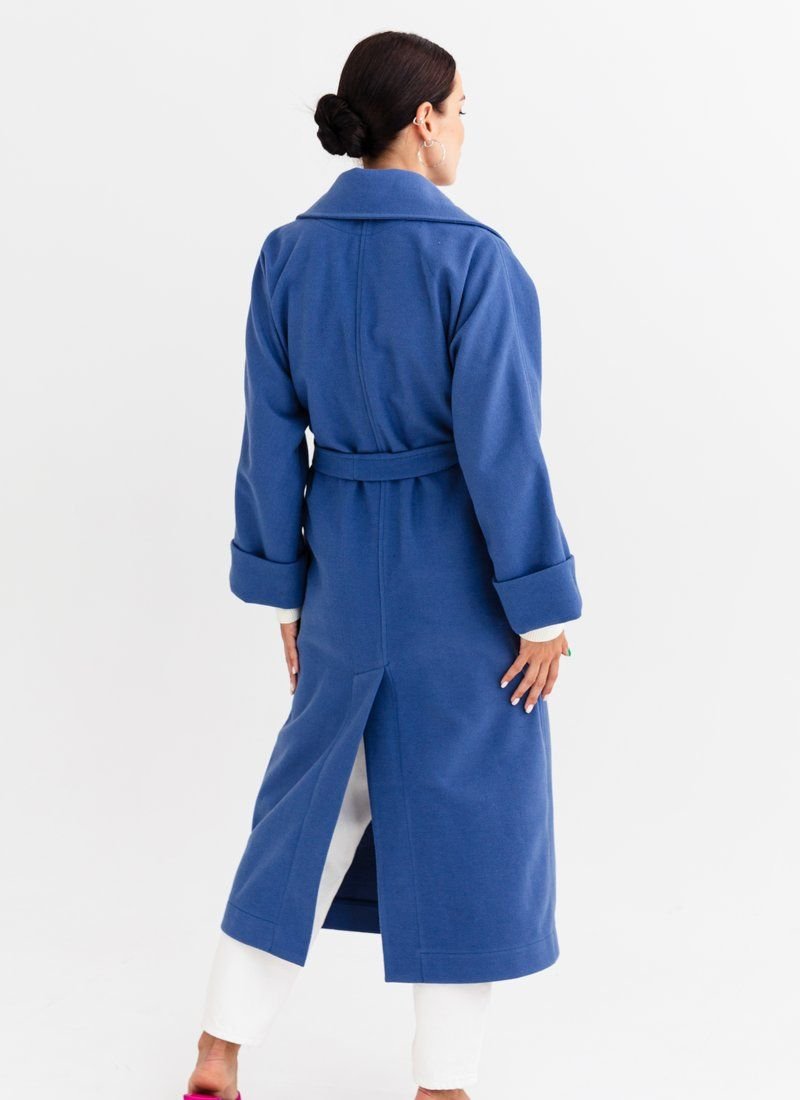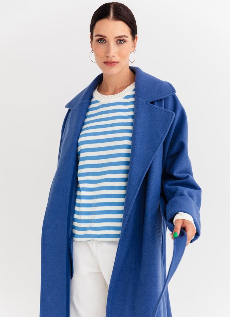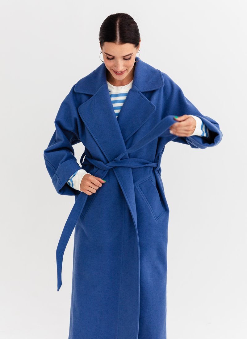 A spectacular demi-season coat without lining, made of soft cashmere fabric. A classic cut model with a turn-down collar, lapels and a voluminous sleeve with a fixed lapel. There are two welt pockets on the sides, a slit-slot and a removable belt-ribbon to match.