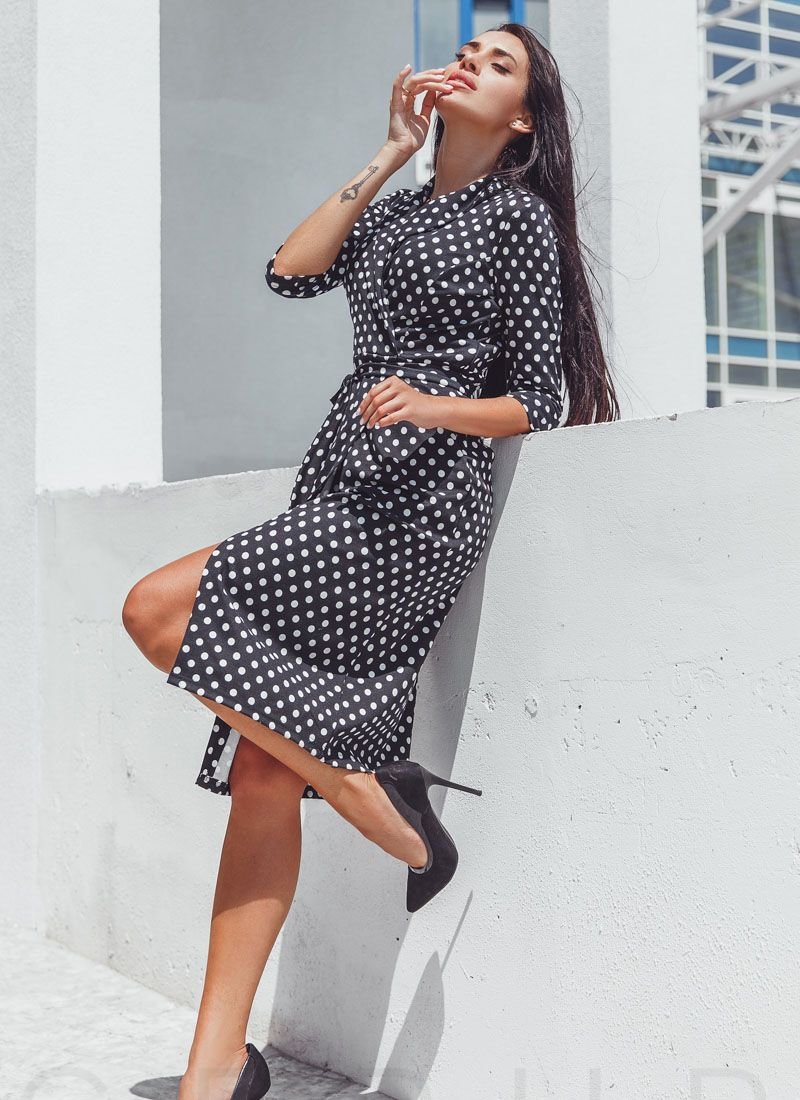 Plain midi dress with small polka dots for a fixed smell, with a shawl collar, long sleeves, a cut-off waist with a removable belt.