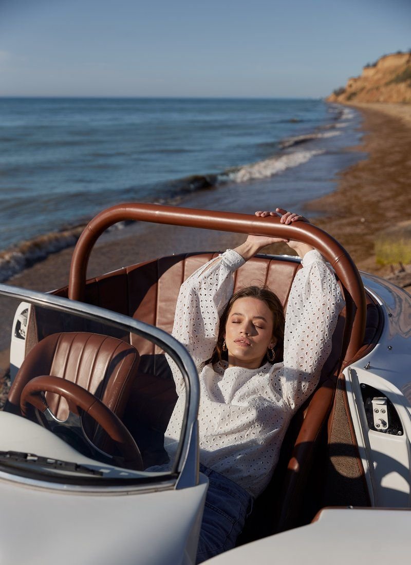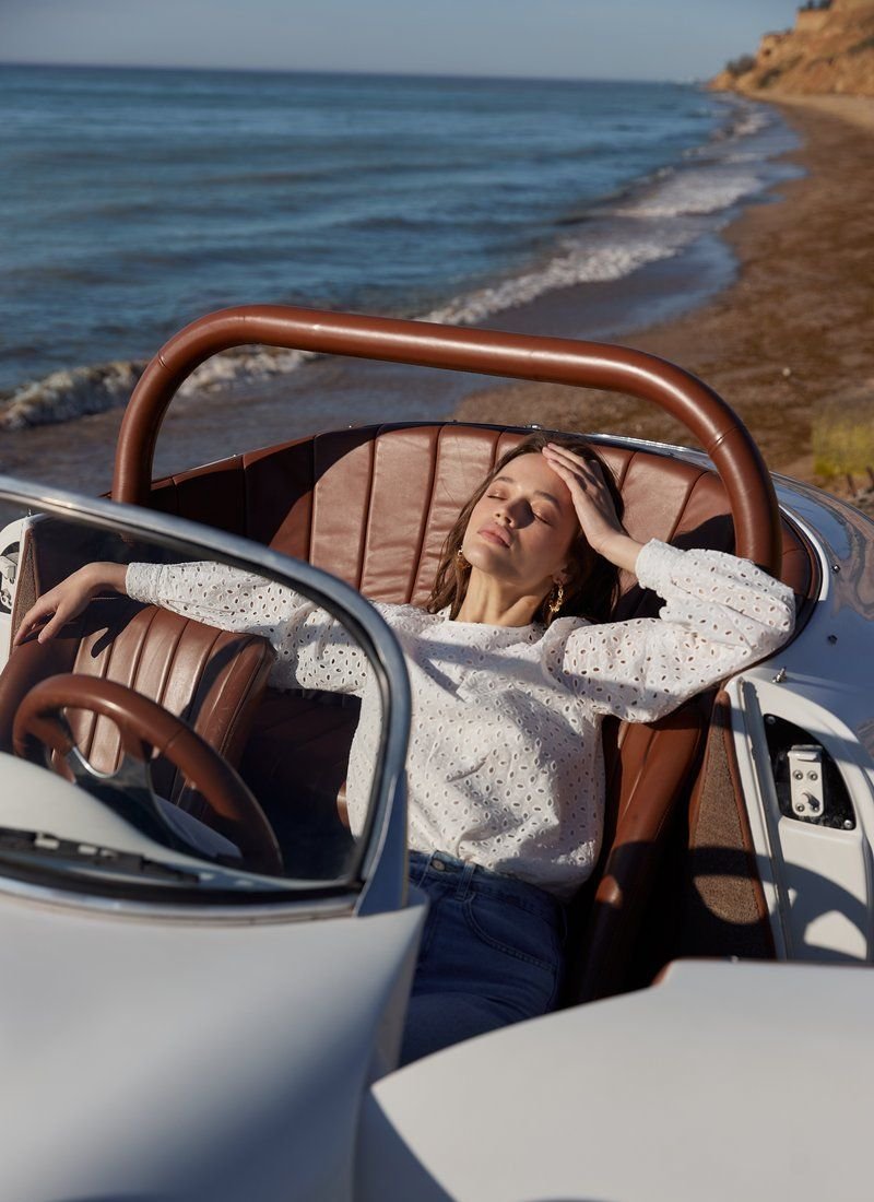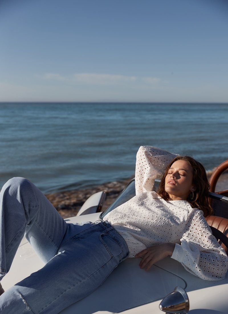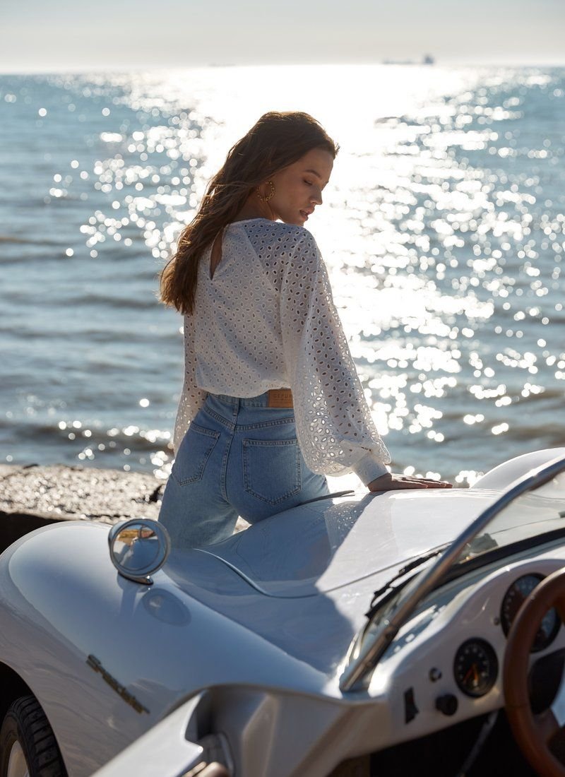 A white blouse made of light stitching can become the basis of a romantic image in the boho style. The model is complemented by an up–to-date SS'21 detail - voluminous sleeves. A loose fit and a pleasant lining to the body will make you feel as comfortable as possible.