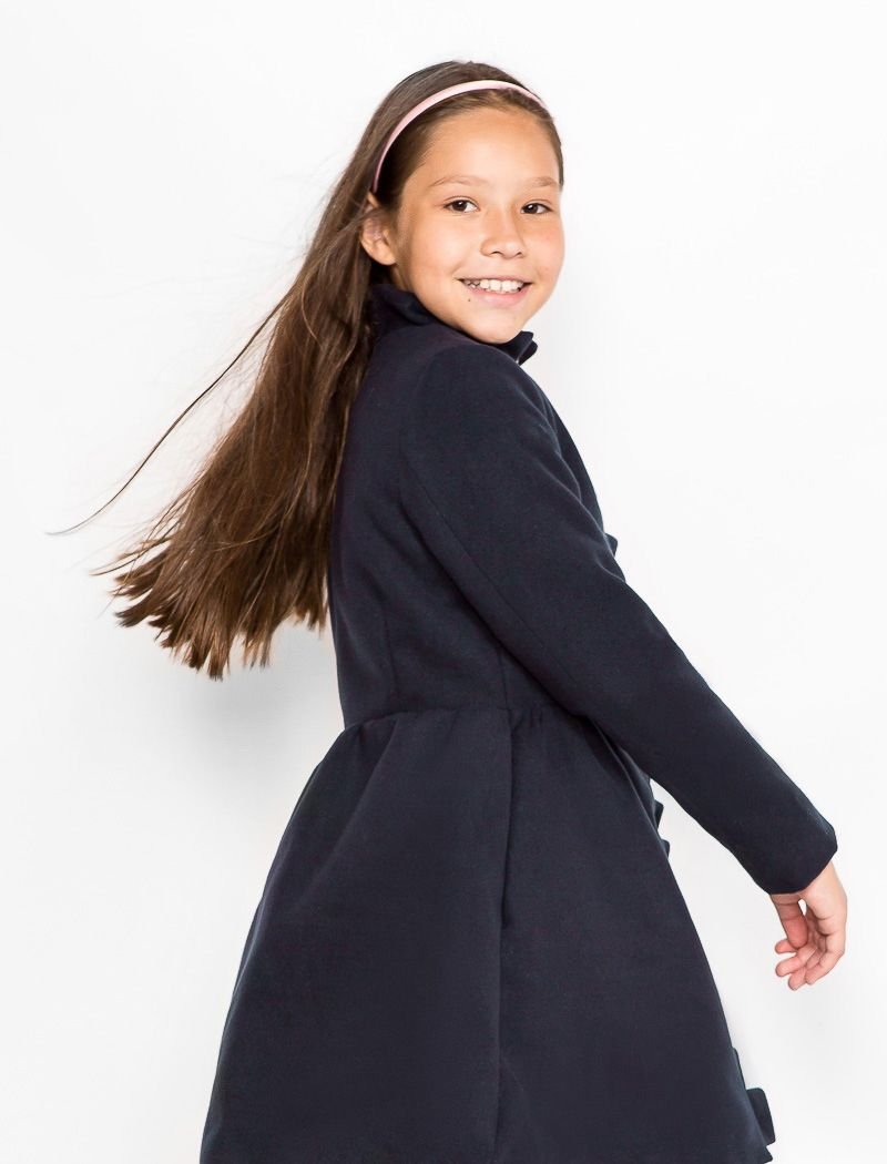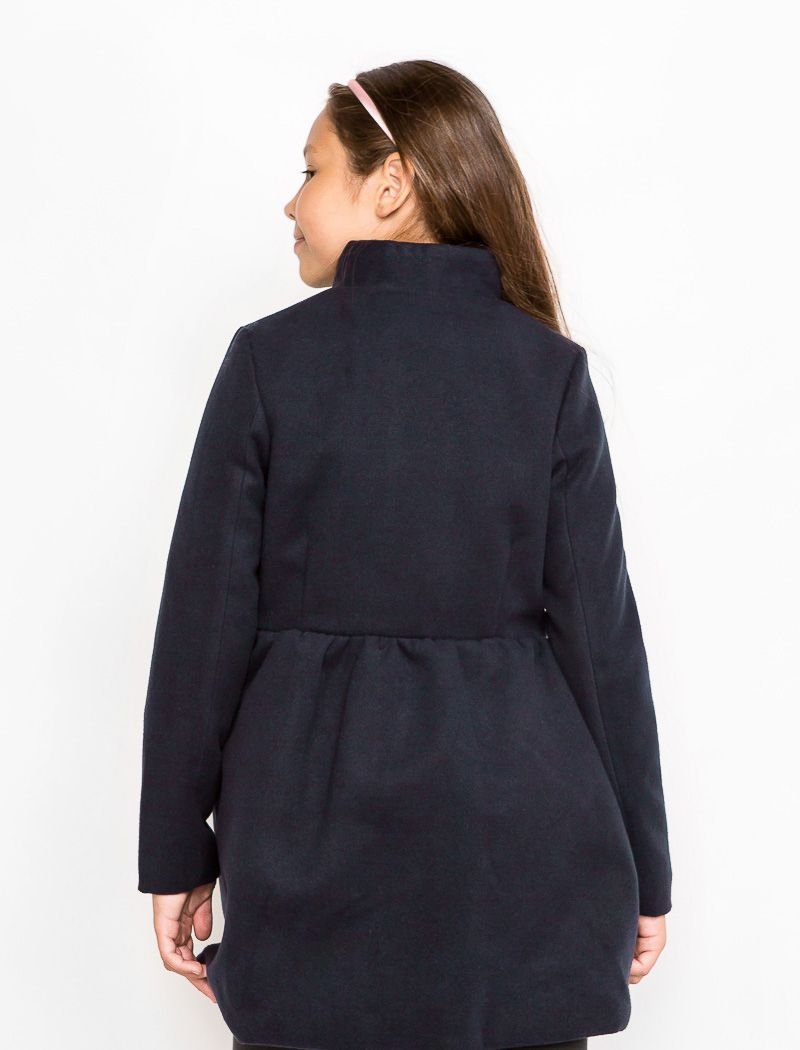 A fitted coat made of eco-cashmere with a short stand-up collar, two pockets in the seams and a placket decorated with small ruffles.