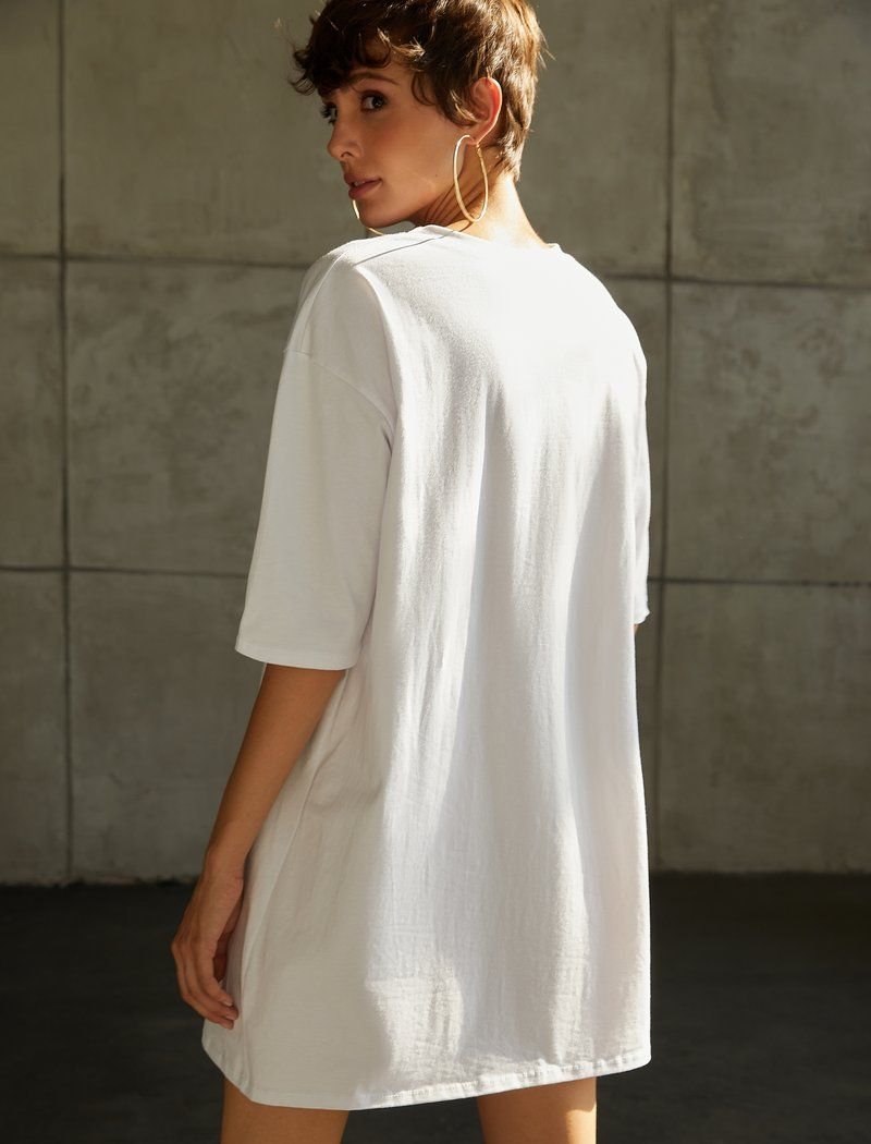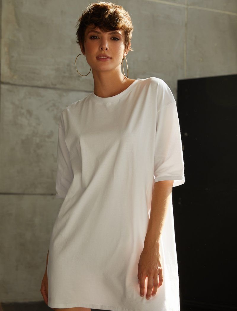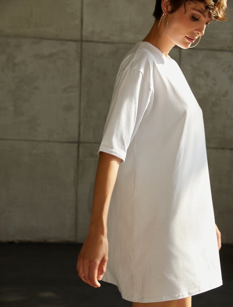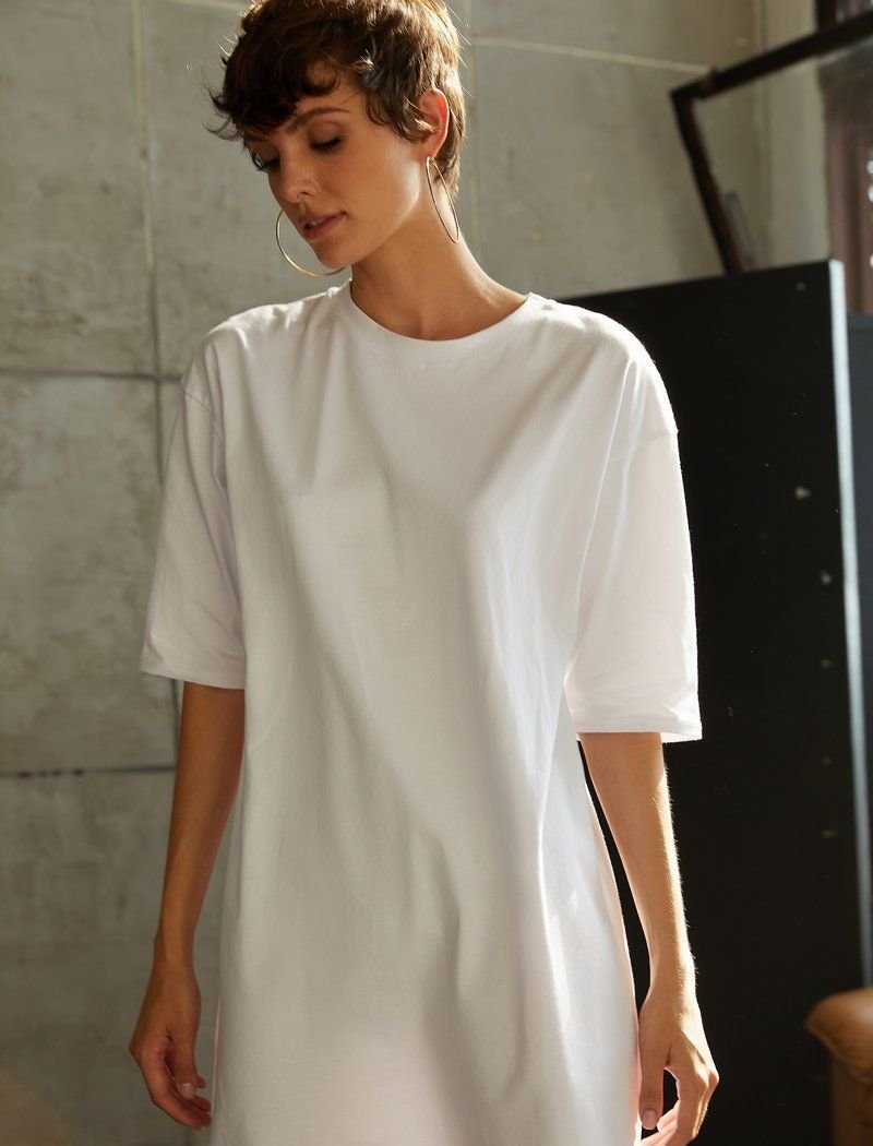Stylish white oversized T-shirt dress for everyday looks. Round neck, short sleeve and mini length. Such a thing will become the basis for your image, if you want to emphasize the waist, you can use a belt or a corset.
