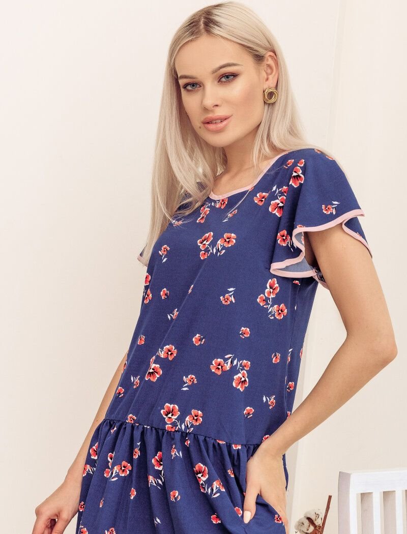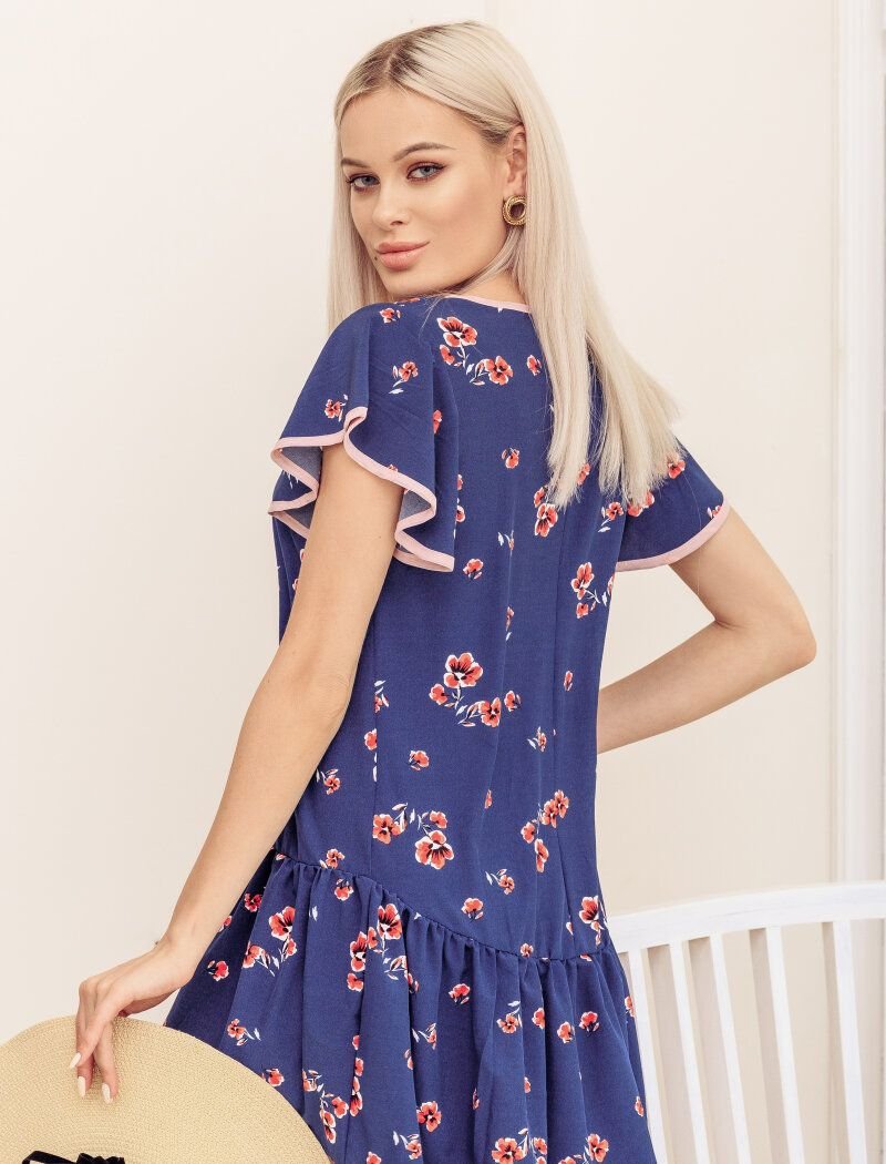 Blue dress with an asymmetric cut with a floral print. Contrasting edging, short flounce sleeve. Straight cut, asymmetric flared skirt in a fold.