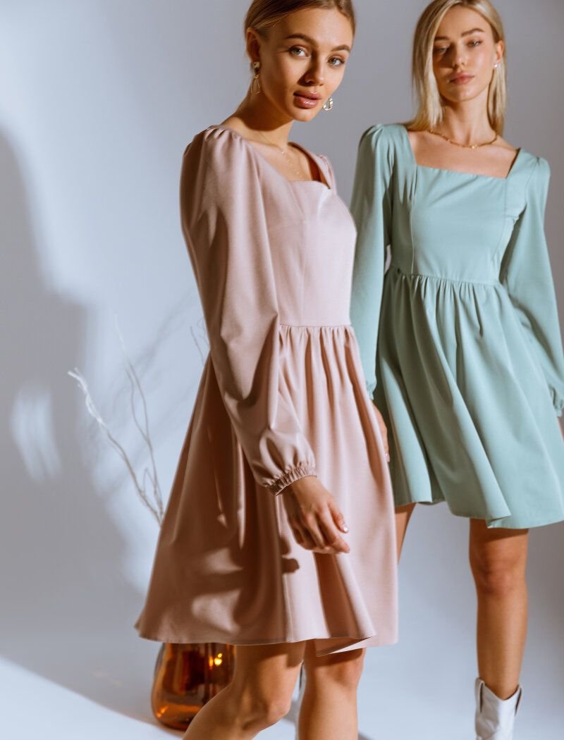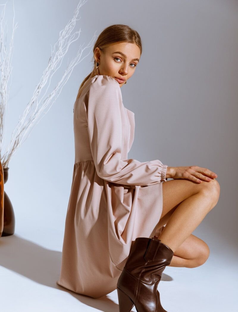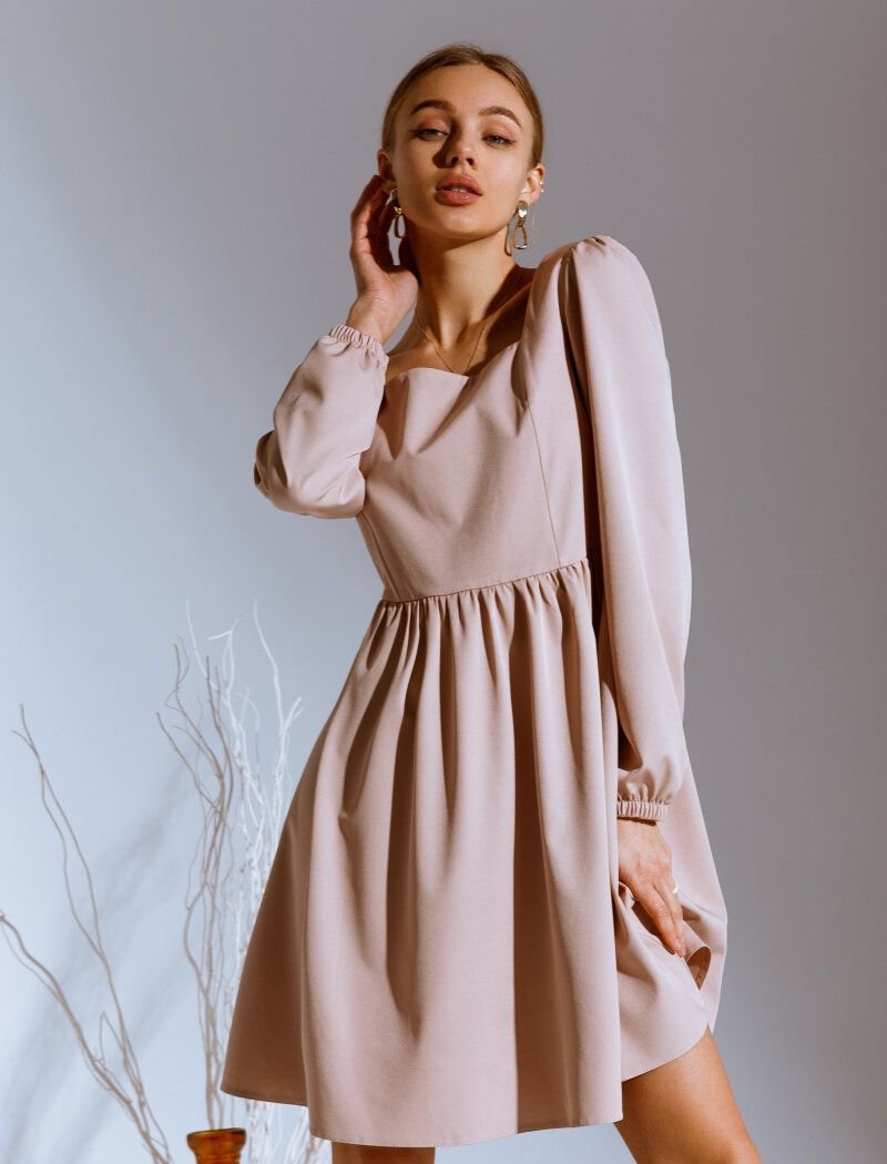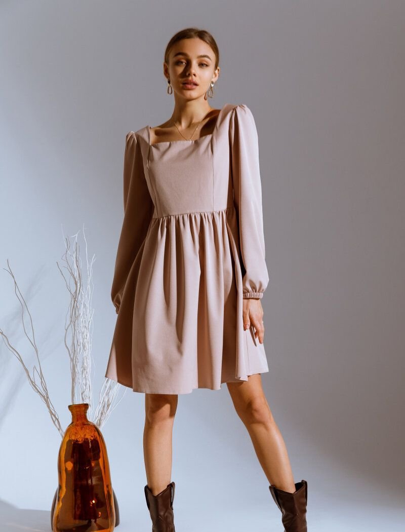 A beige mini dress with a fitted cut is ideal for bows in a romantic style. A square square neckline accentuates the decollete area, and the final accent of the image is put by loose sleeves on elastic cuffs.