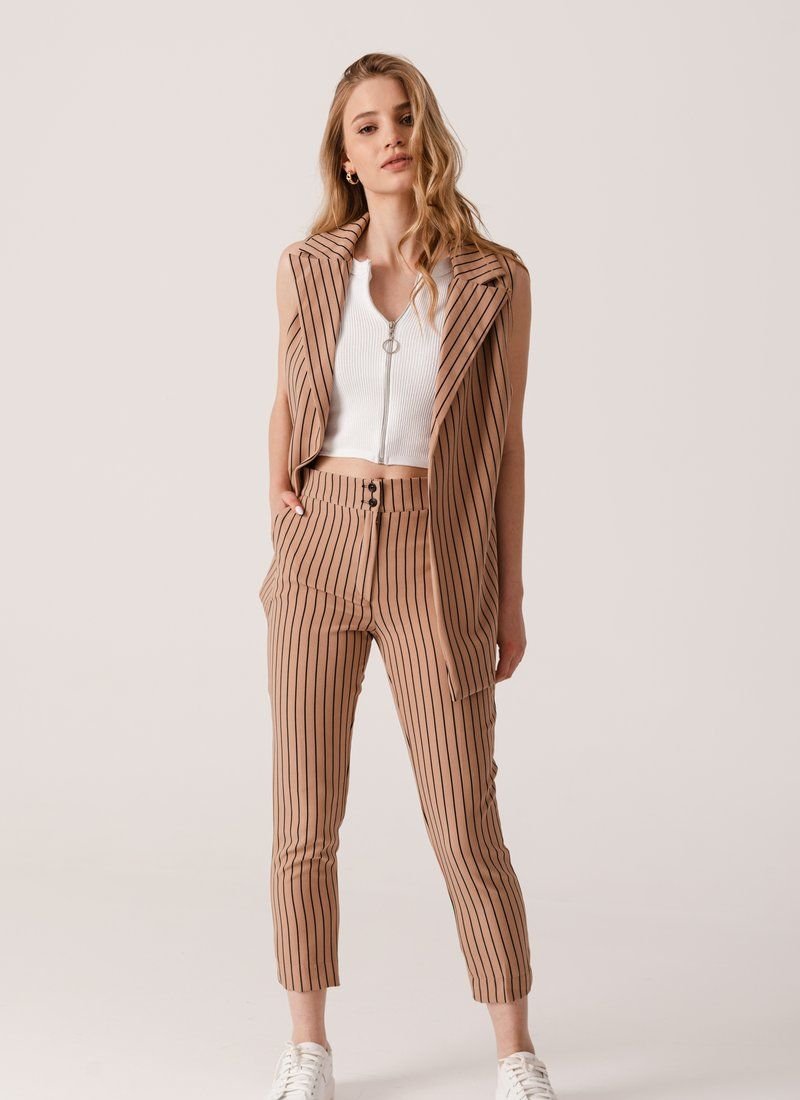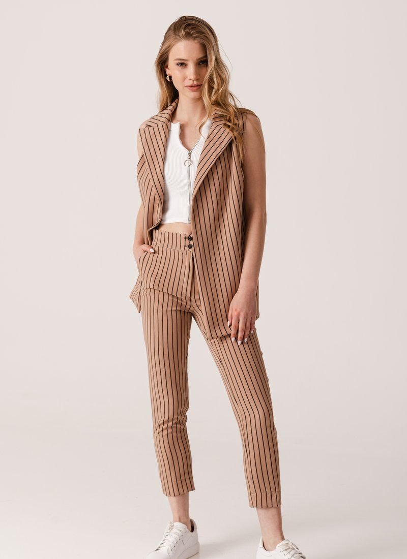 A striped print suit is a universal soldier in the wardrobe: the model will fit equally harmoniously into both office and casual attire. Soft and dense costume material was chosen for sewing models from cropped tight-fitting trousers and a jacket in a classic style. The waistline was formed with a belt-ribbon.