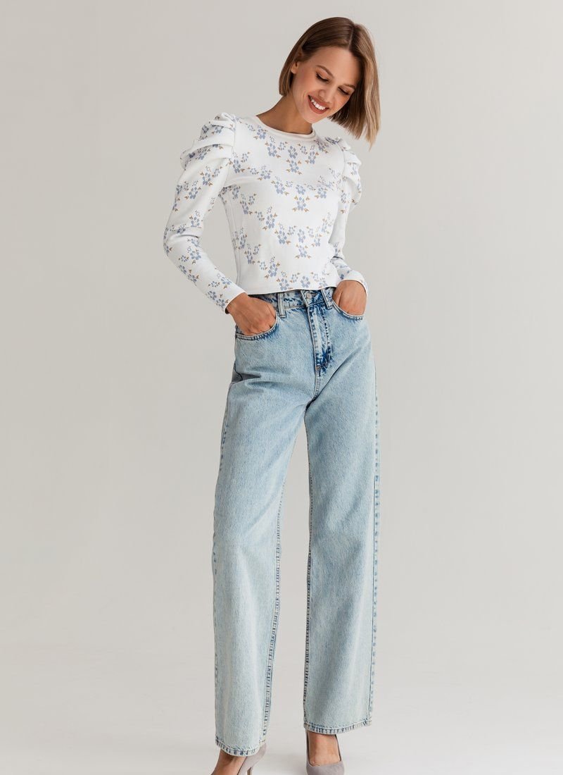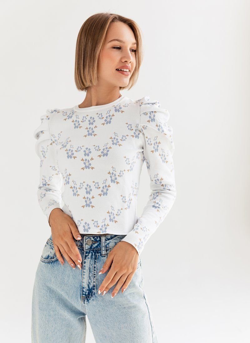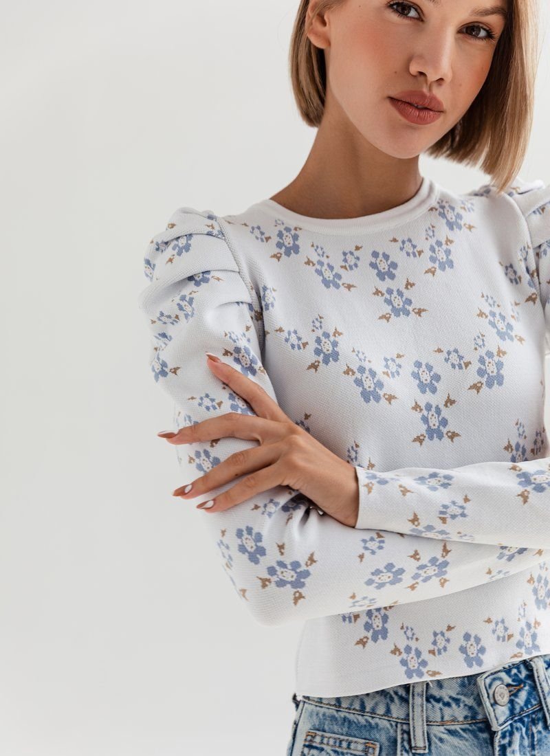Knitted jumper in a delicate floral print. The model is decorated with lantern sleeves, which adds zest to it.