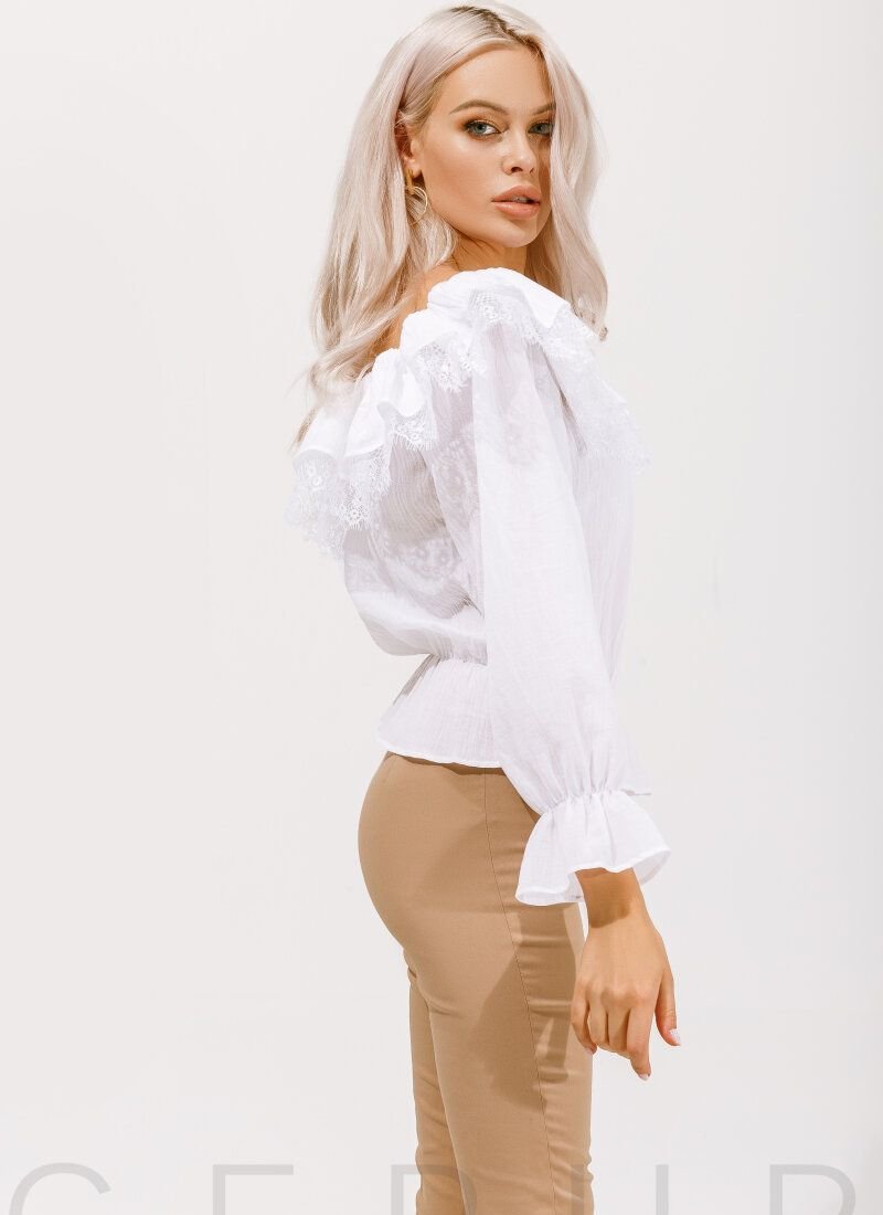 A spectacular blouse decorated with sophisticated lace. Elastic insert on the shoulders and bottom edge, voluminous sleeves and flounces.