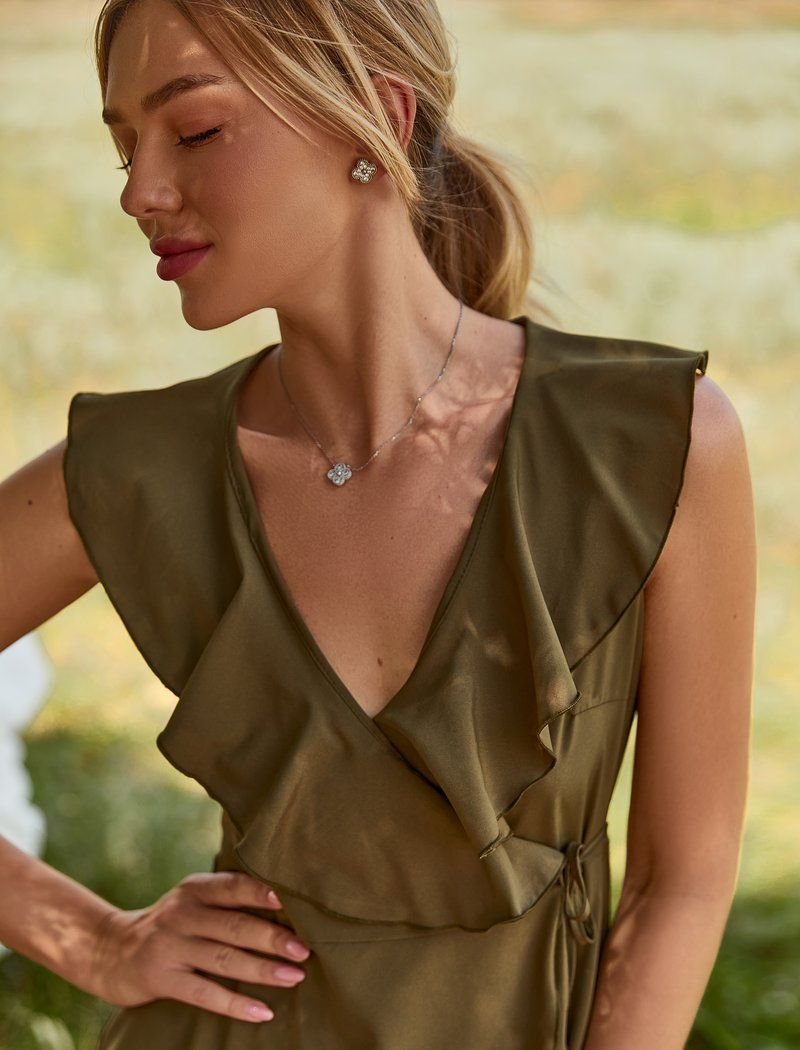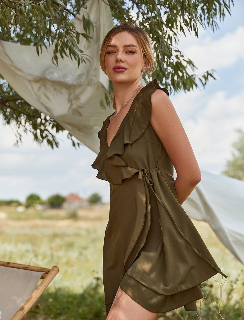 An airy dress for the smell, made of light fabric. A deep v-shaped neckline on the chest, a sewn multi-tiered skirt and a flounce decor.