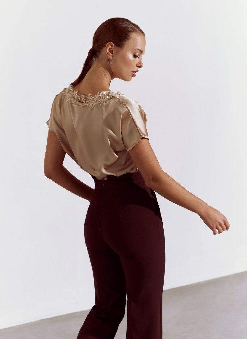 Silk blouse with a deep v-neck, decorated with sophisticated lace decor, and with a one-piece sleeve.