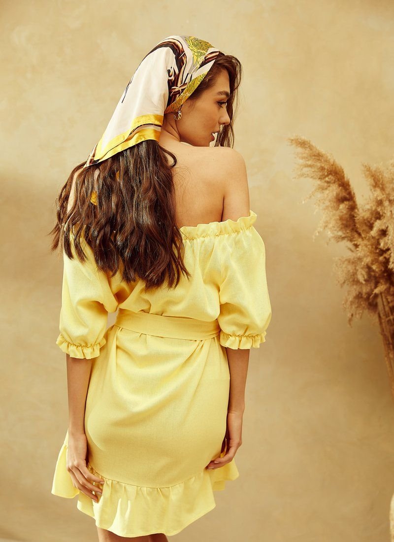Summer dress of romantic cut, made of yellow linen. An open shoulder line with an elastic insert, a short sleeve with a cuff and a short loose skirt decorated with frills at the hem. The dress is complemented by a removable belt-ribbon, which emphasizes the waistline.