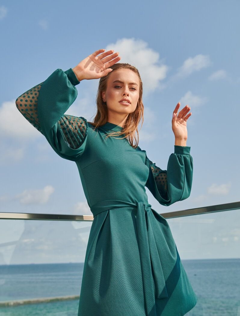 It is enough to bet on the right color to attract attention. For example, on the bottle shade of the dress. Combined voluminous sleeves made of translucent lace material on the cuffs give the model femininity. The dress with a flared skirt is complemented by pinches at the waist. The set includes a removable belt-tape.