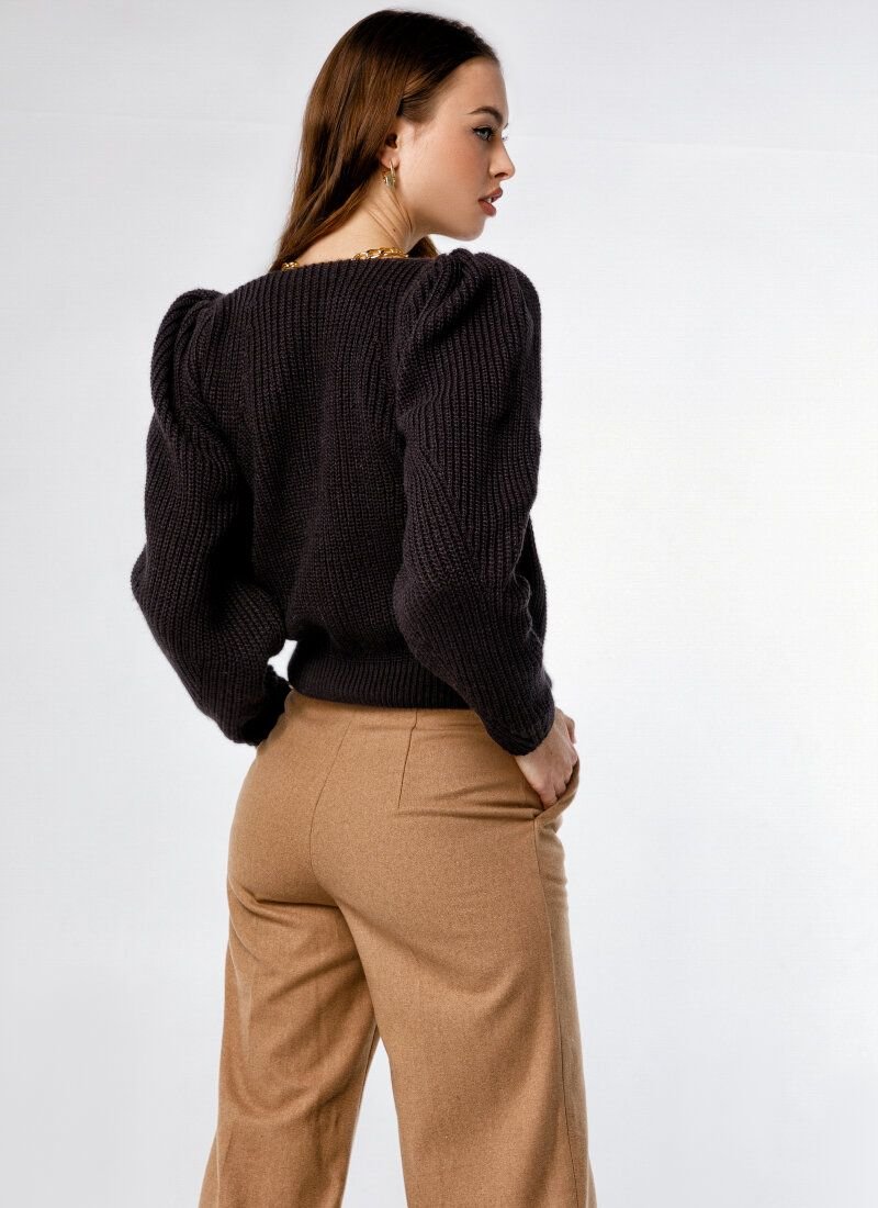 The basic black jumper is knitted from a mixed wool yarn - a soft and durable material. The model is complemented by voluminous sleeves with pinches on the shoulders. The fitted cut is formed by an elastic bottom edge.