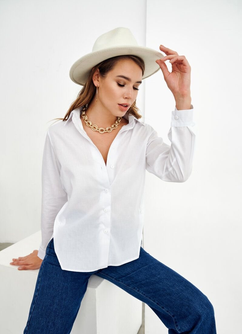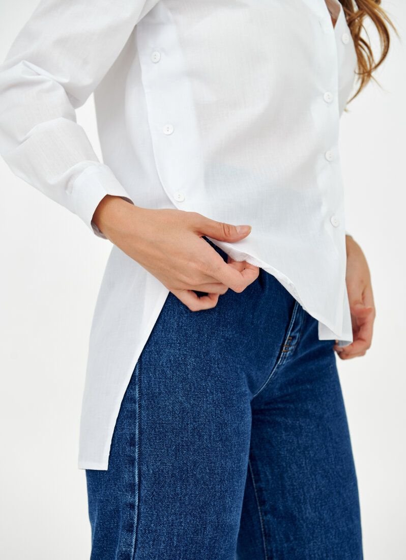 Stylish cotton shirt of asymmetrical cut: neat turn-down collar, long sleeve with cuff, elongated back and side slits with button closure.