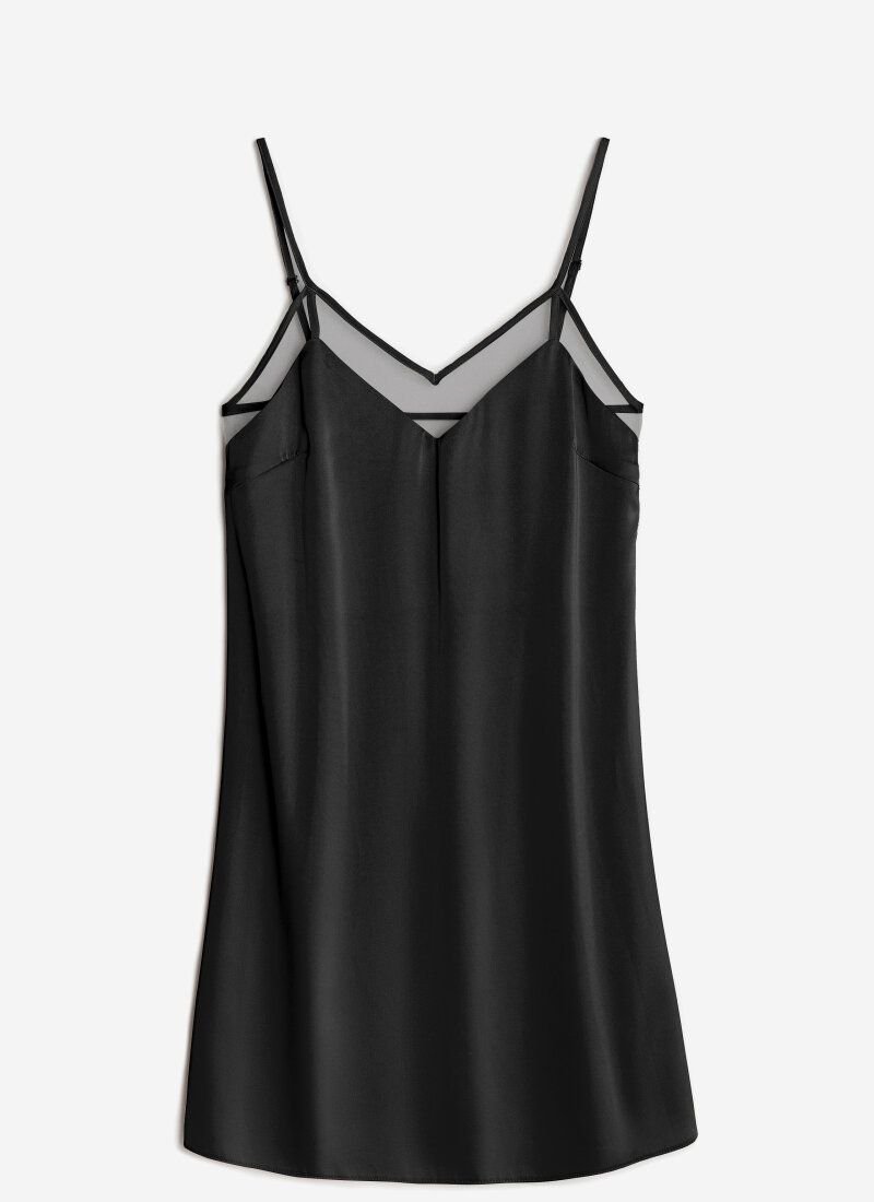 The black combination forms a feminine silhouette and emphasizes all the advantages of the figure. The thing is made of flowing silk, which passes air well. The bodice is trimmed with translucent mesh material, which adds a seductive accent to the image.