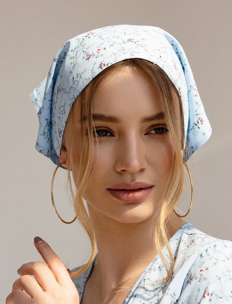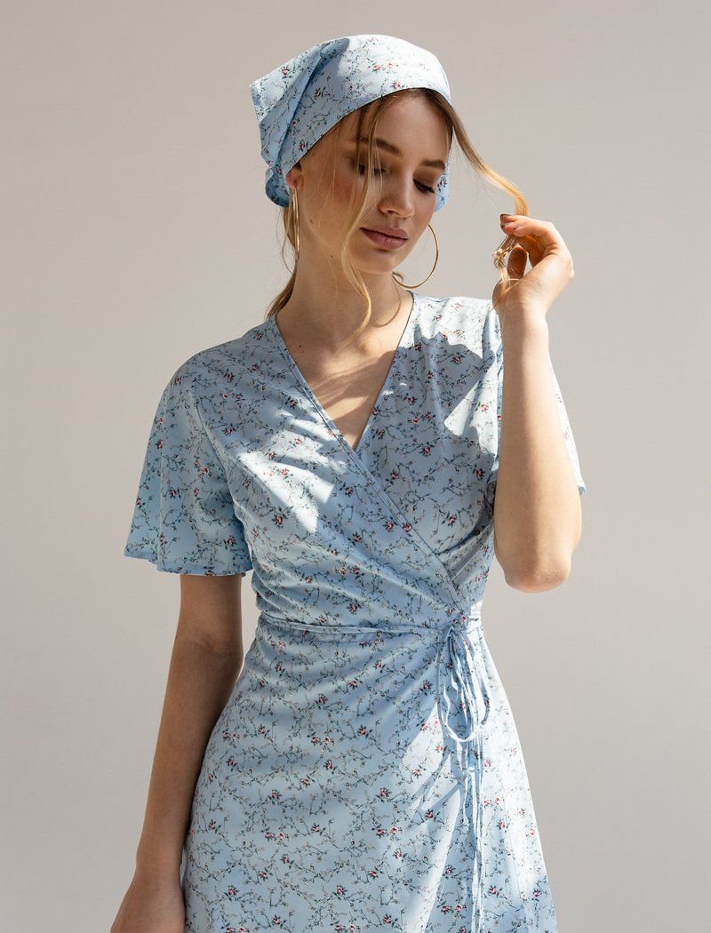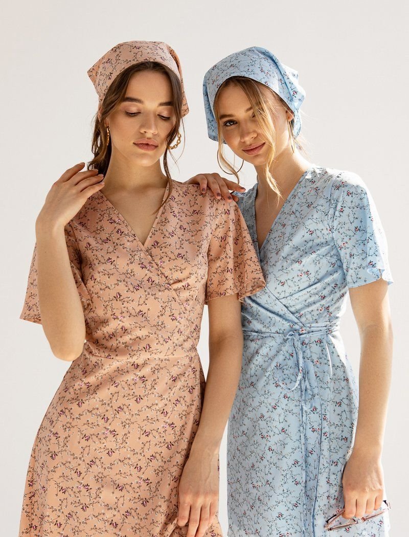Thanks to the universal cut on the back?x, blue mini dress is suitable for all types of figures. The key element of the model was a delicate floral print, which in the SS21 season is found at the shows of Valentino and Balenciaga. As an additional accessory, the product was supplemented with a kerchief.