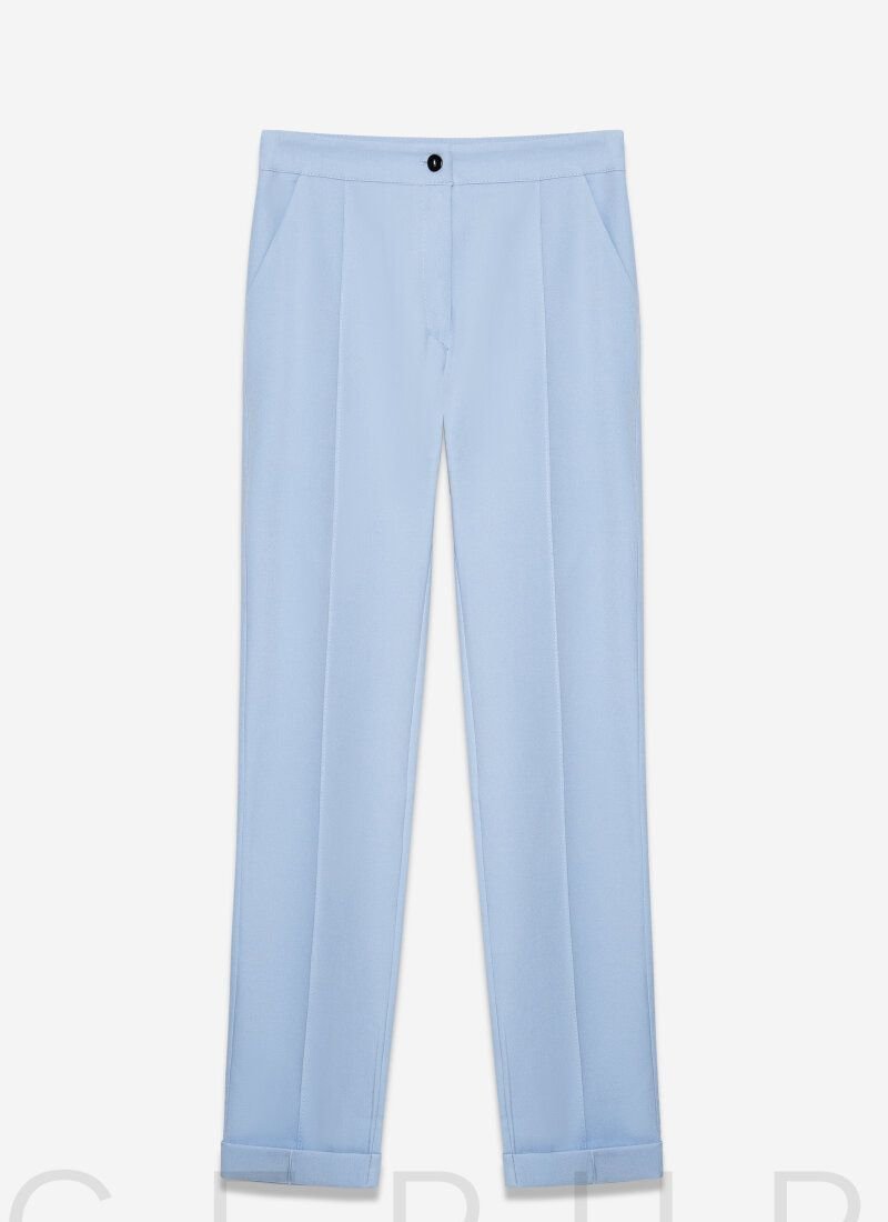 Casual solid blue suit. A loose-fitting blazer with a turn-down collar, lapels, a long sleeve and fake pockets in the front. Trousers of a straight cut, medium fit, with two welt pockets on the sides, fixed arrows along the entire length and lapels.