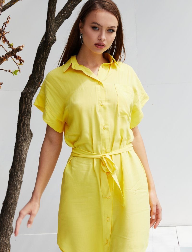 With all the minimalistic design, the shirt dress does not look simple. The mood was set with the help of a rich yellow shade. For sewing the model, we chose light cotton with the addition of synthetic threads. The waistline was accentuated with a belt-ribbon.