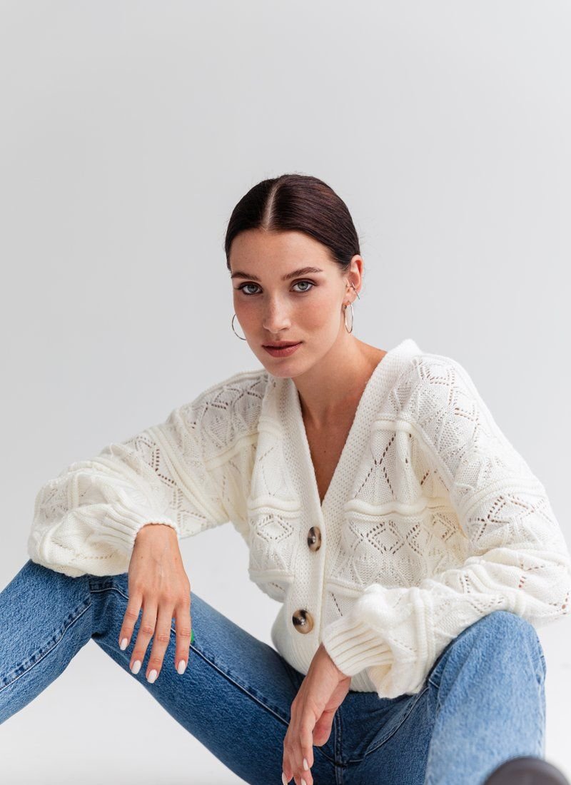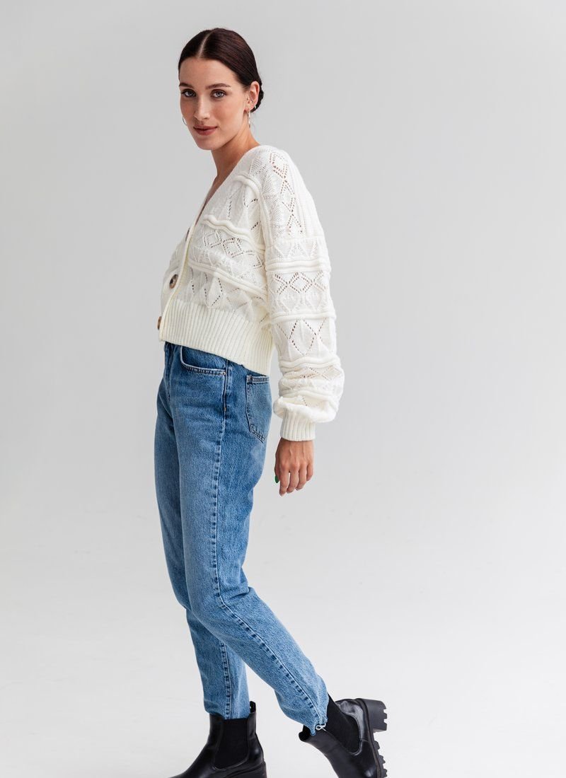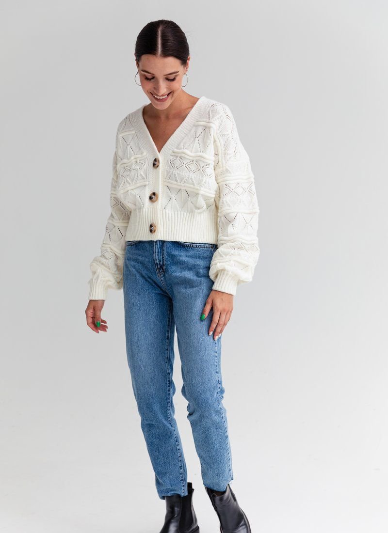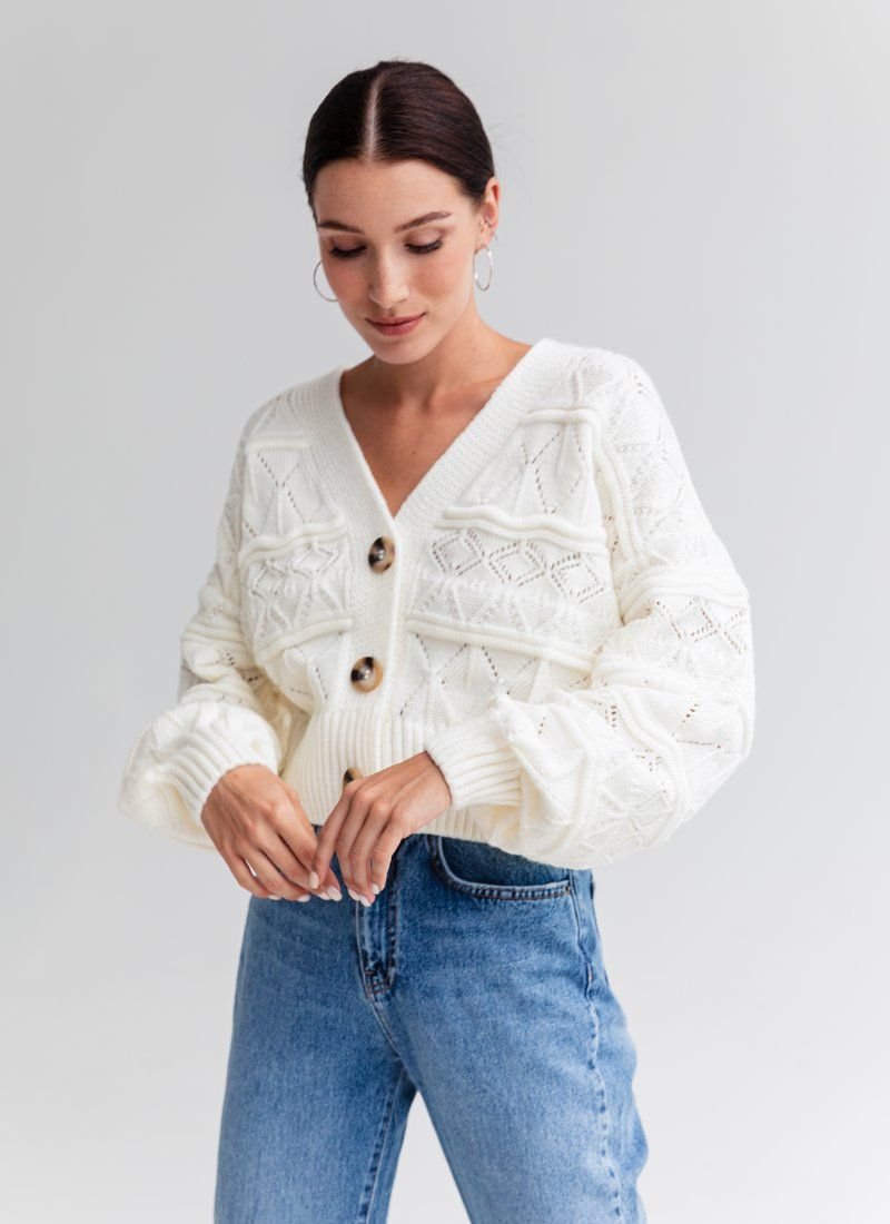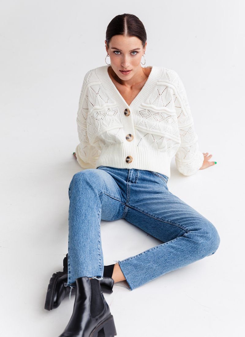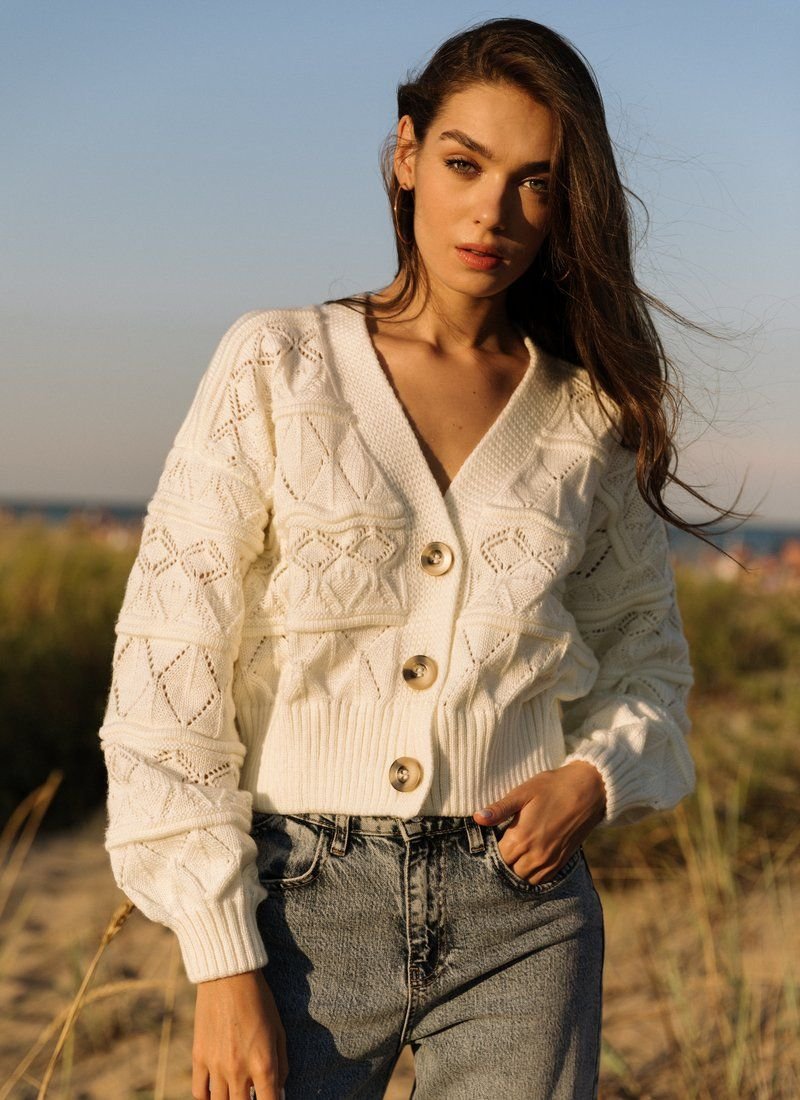 A cropped cardigan of a delicate milky shade will harmoniously complement the casual look with jeans. The model is made of textured knitted knitwear. The product with a loose cut is complemented by a v-neck, emphasizing the decollete area. The cardigan is fastened with large buttons.