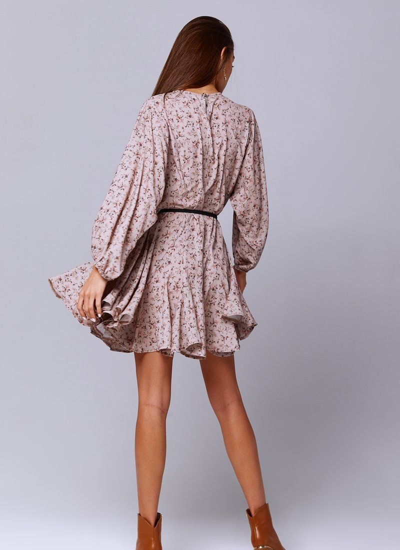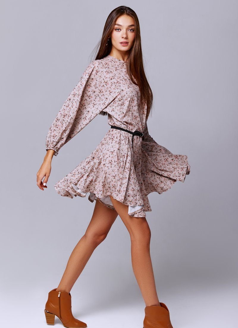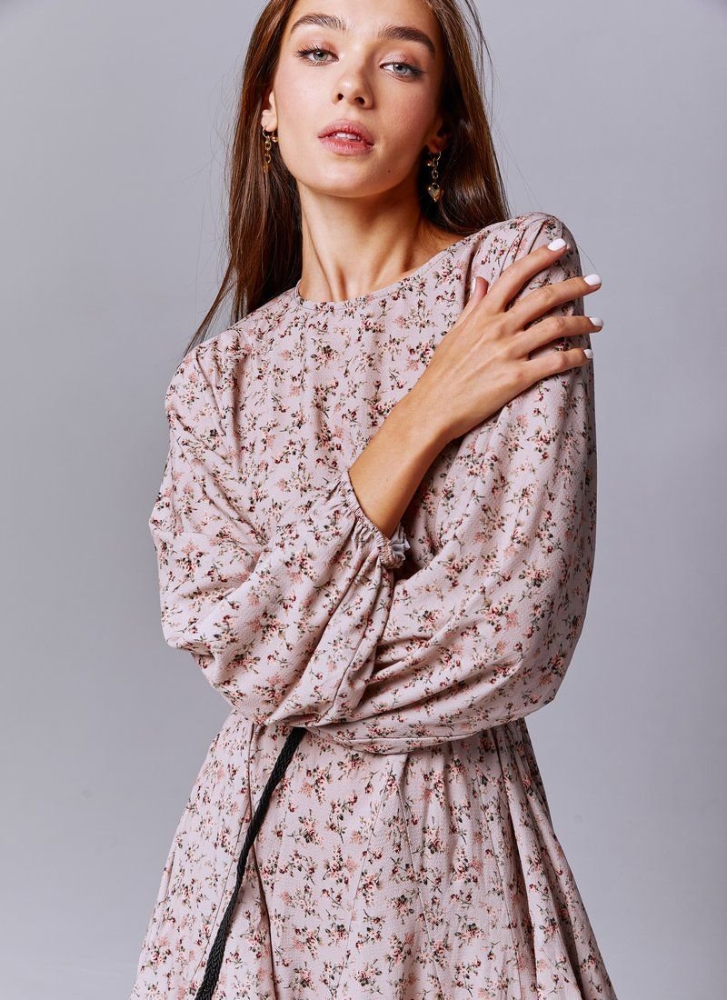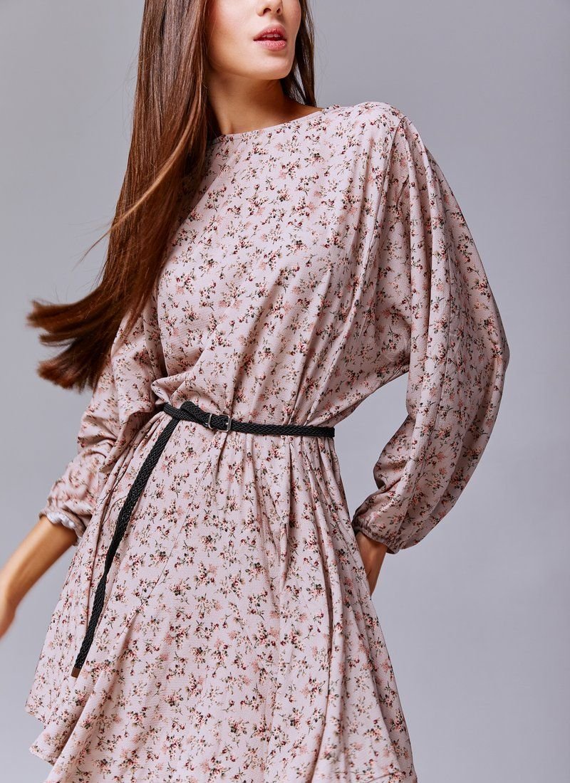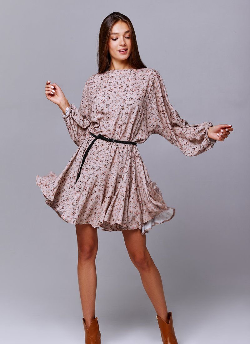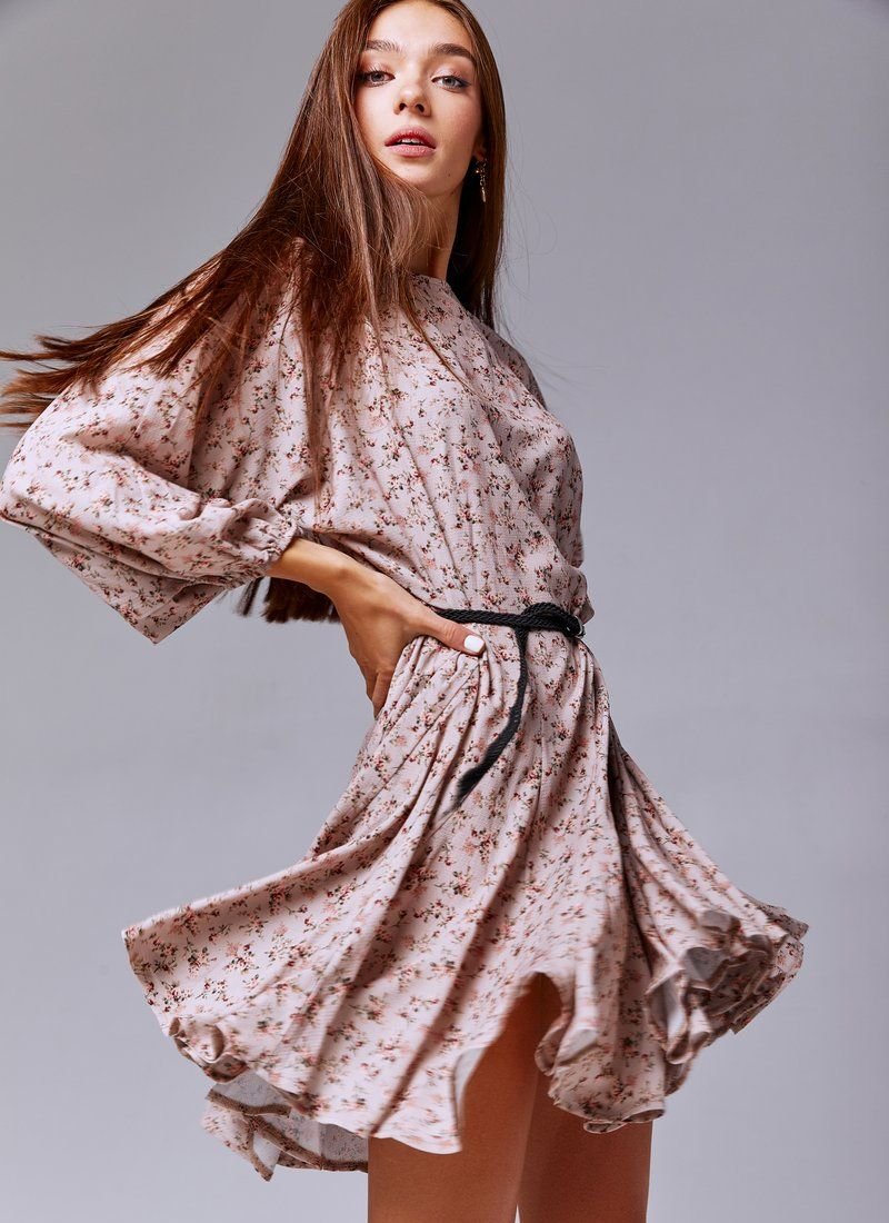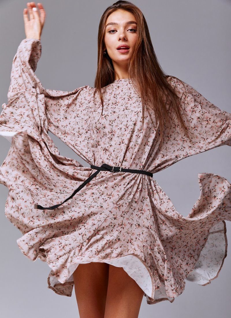 Beige chiffon dress in floral print, loose fit. The model is presented with trendy wide sleeves, elastic insert on the cuffs. The set includes a belt, if desired, you can emphasize the waist.
