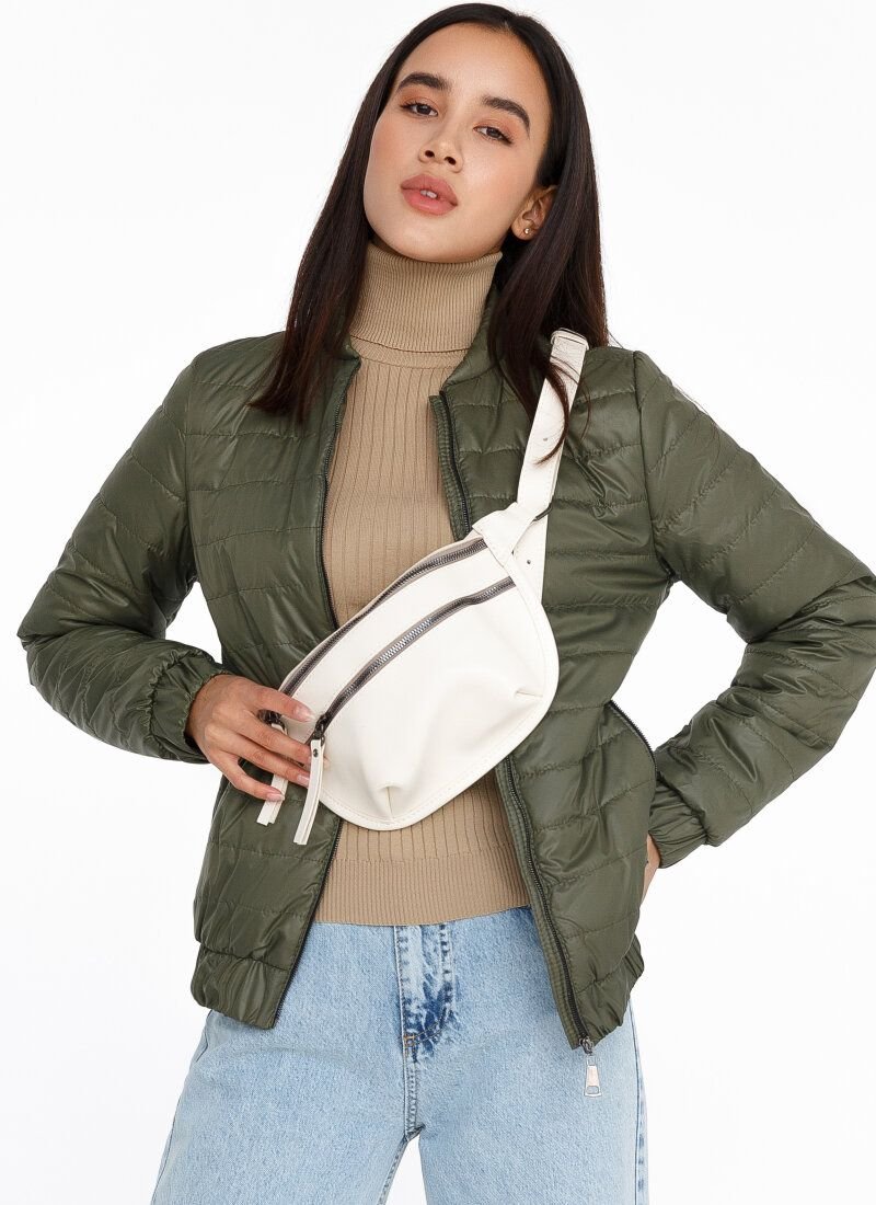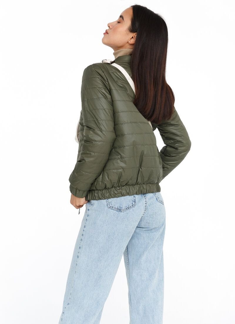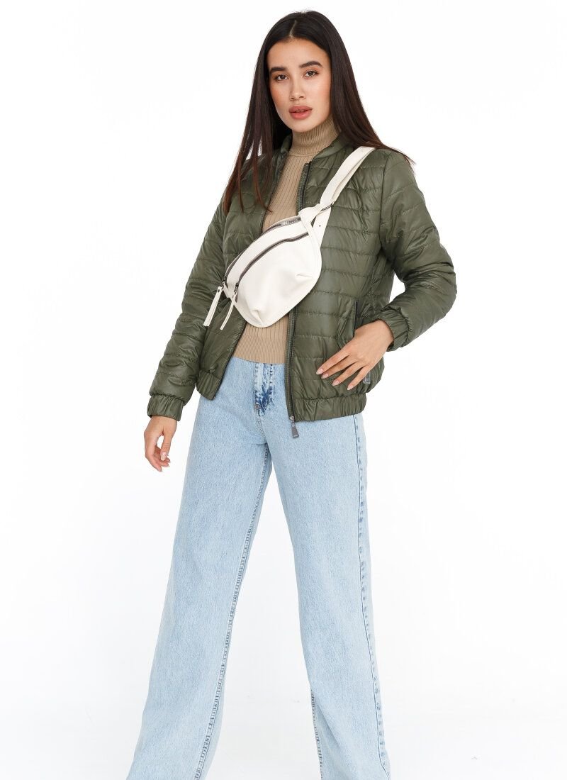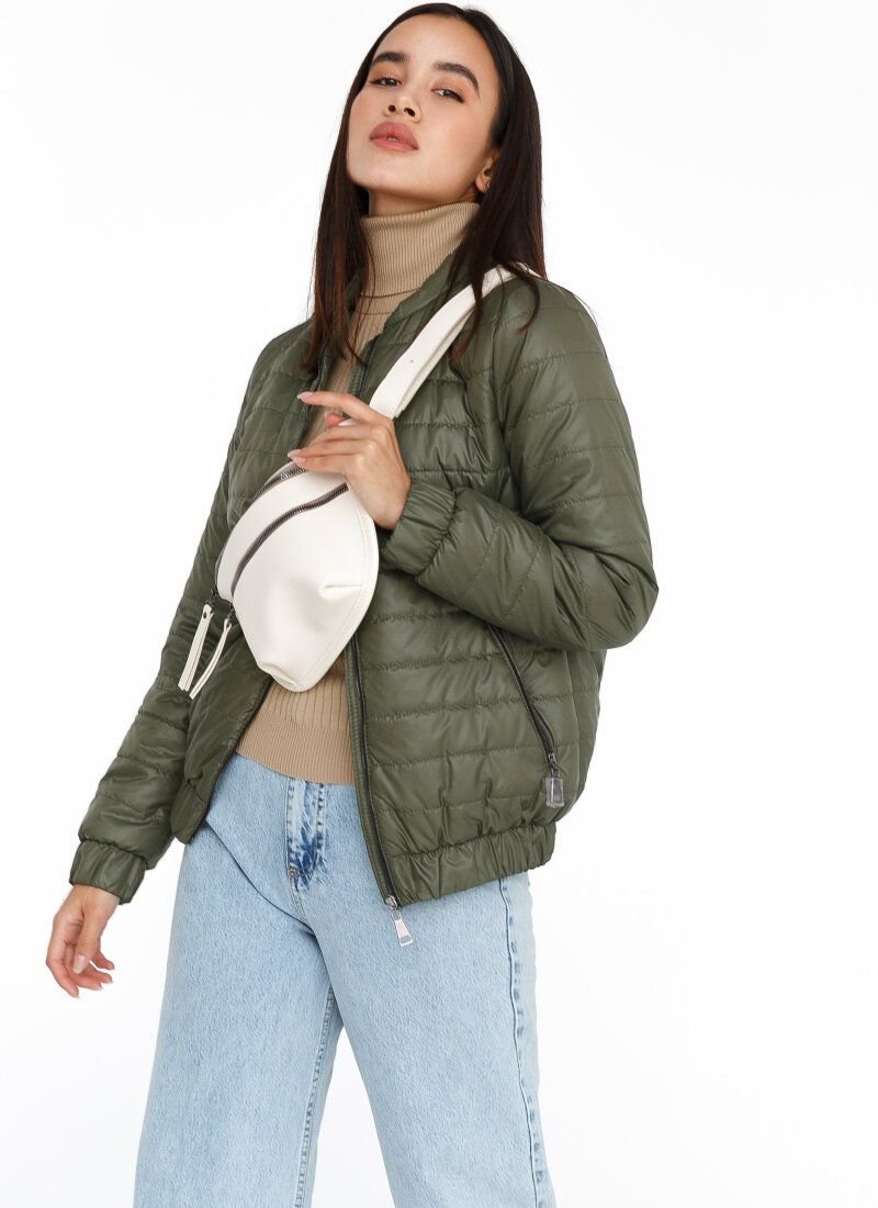 Khaki bomber jacket made of smooth waterproof raincoat material with a silky shine and insulation. The laconic cut is combined with a quilted stripe pattern. The long sleeve and the bottom edge are complemented by an elastic insert. On the front shelf there are two patch pockets with a zipper.Features: silicone acts as a heater (100 g/m2). Please note that the product is designed for temperatures up to +5 ° C.