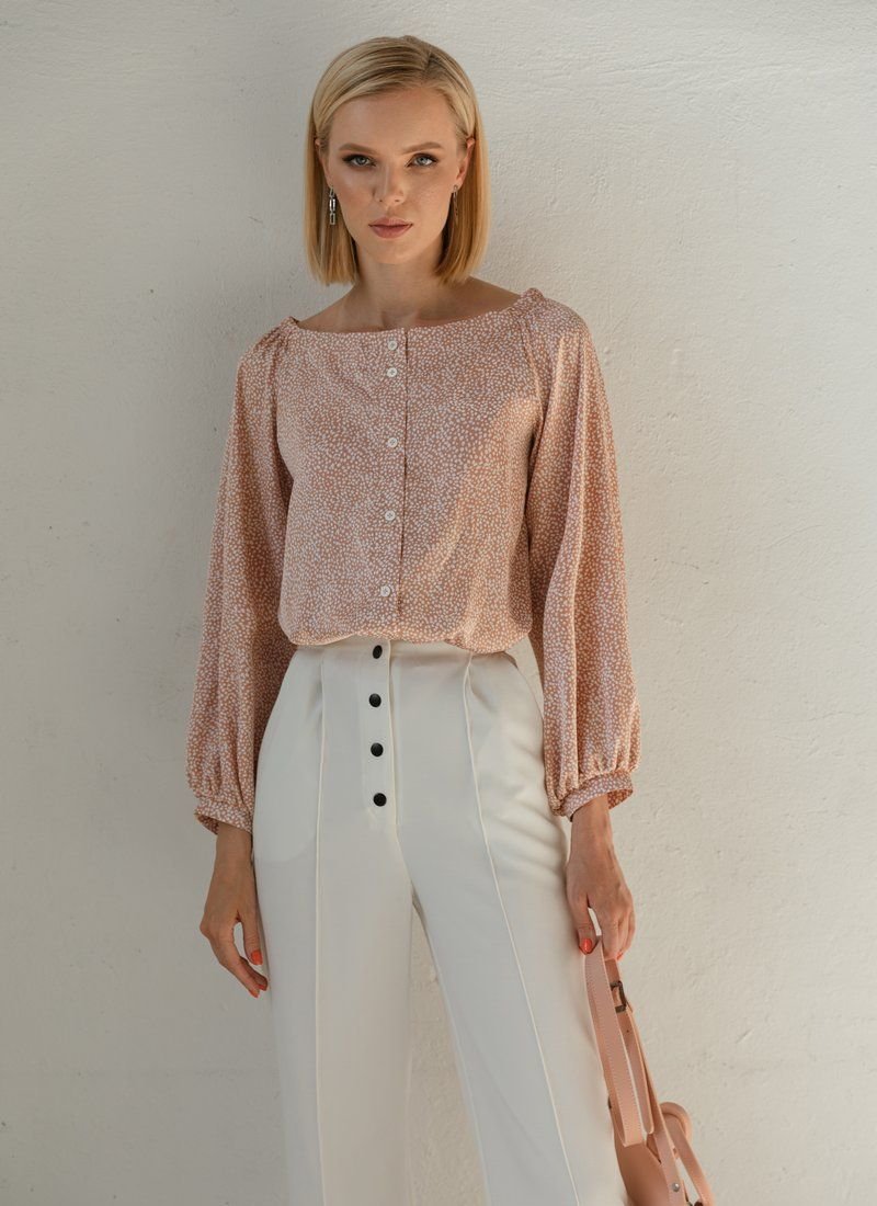 Beige silk blouse with small white polka dots, with a boat neck and an elastic insert on the back. Buttons on the front, long loose sleeve with thin cuffs.