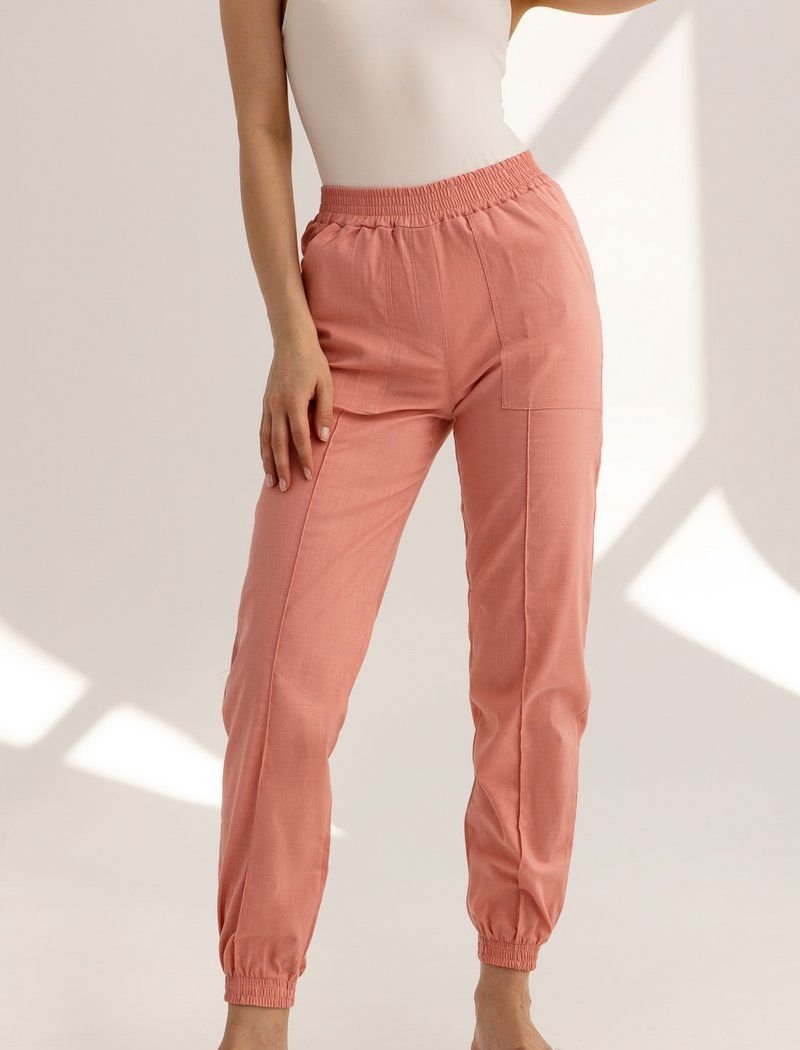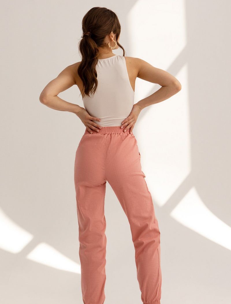 Pink joggers with pockets and a wide elastic waistband are a good investment in the casual wardrobe of the spring-summer season. The legs were supplemented with fixed arrows that visually stretch the silhouette. For sewing the product, the designers used a thin, light material.