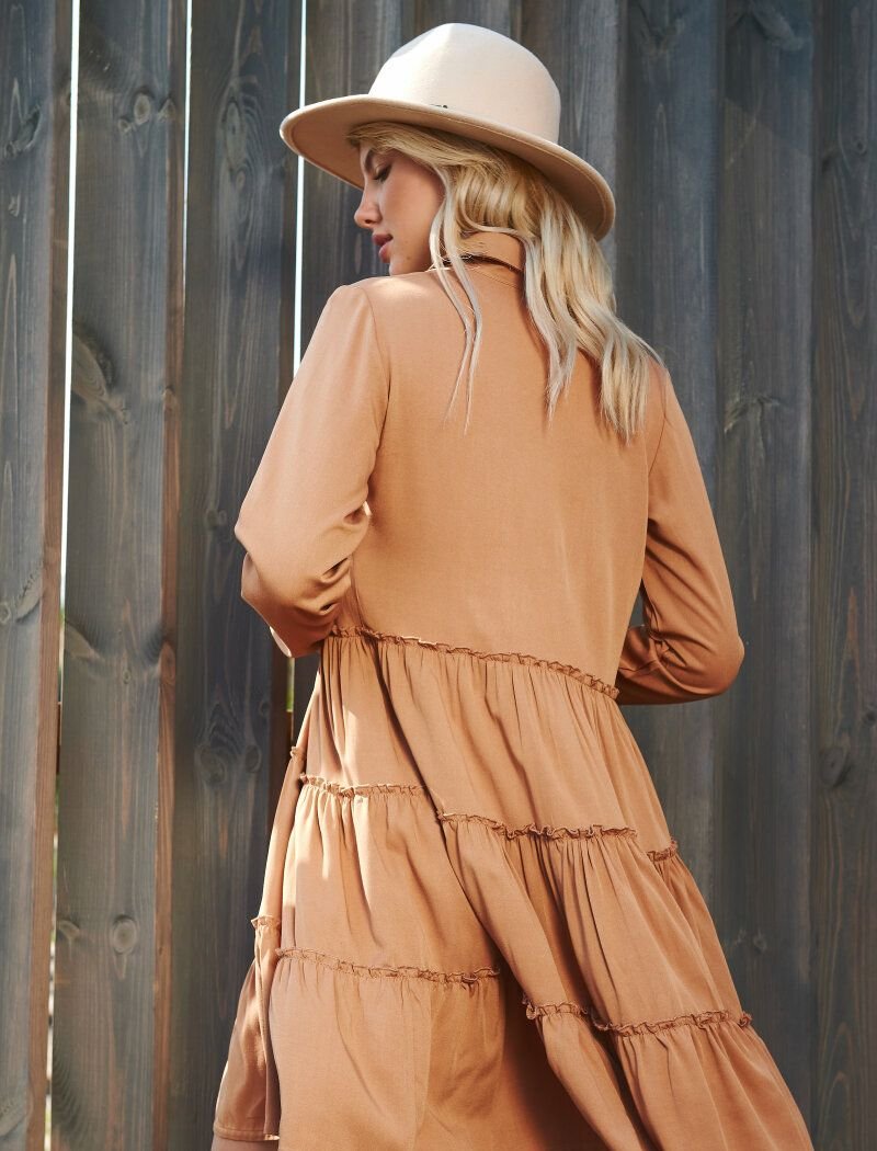 A beige dress with a loose cut will prove that you can look feminine not only in tight-fitting models. A multi-tiered skirt and elements of a shirt style are responsible for the right mood: a turn-down collar and a button placket.