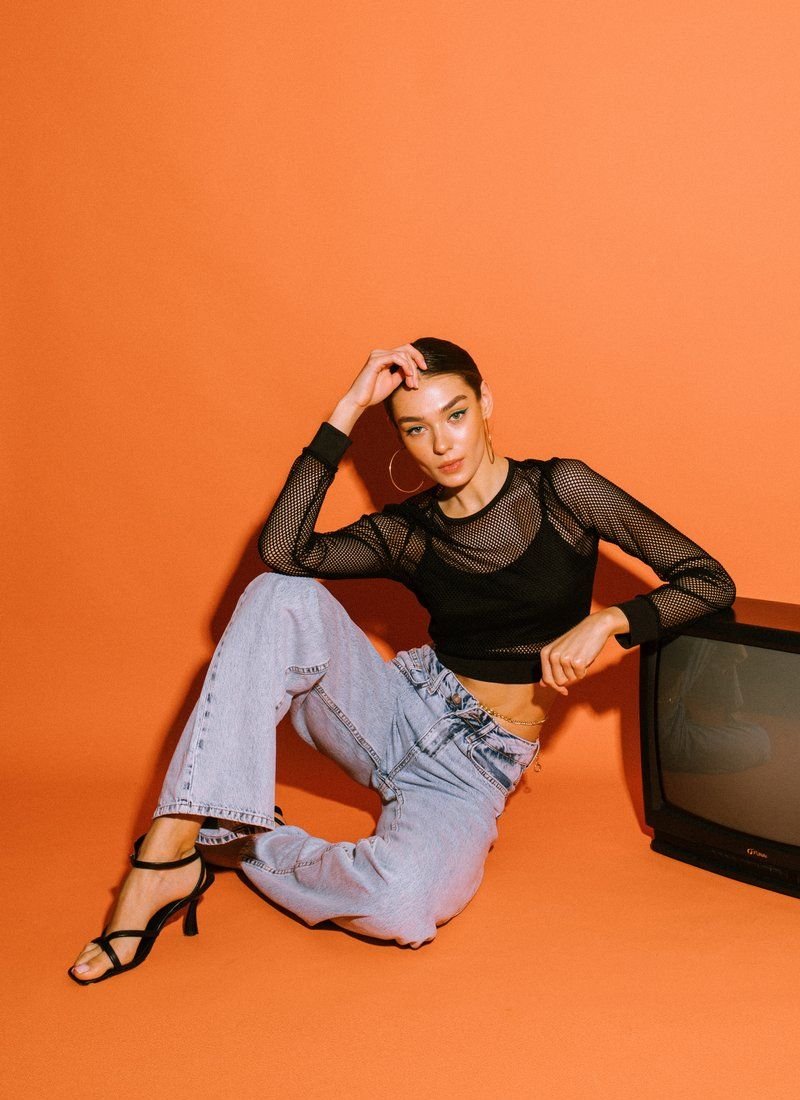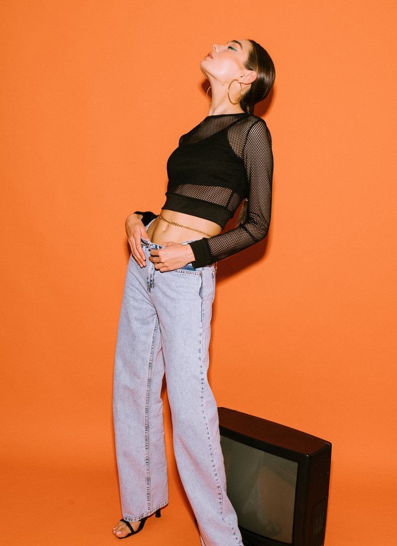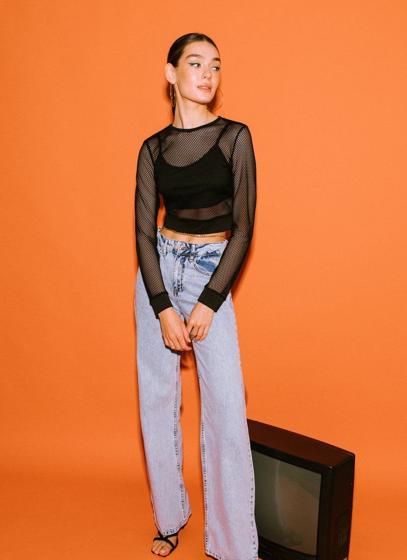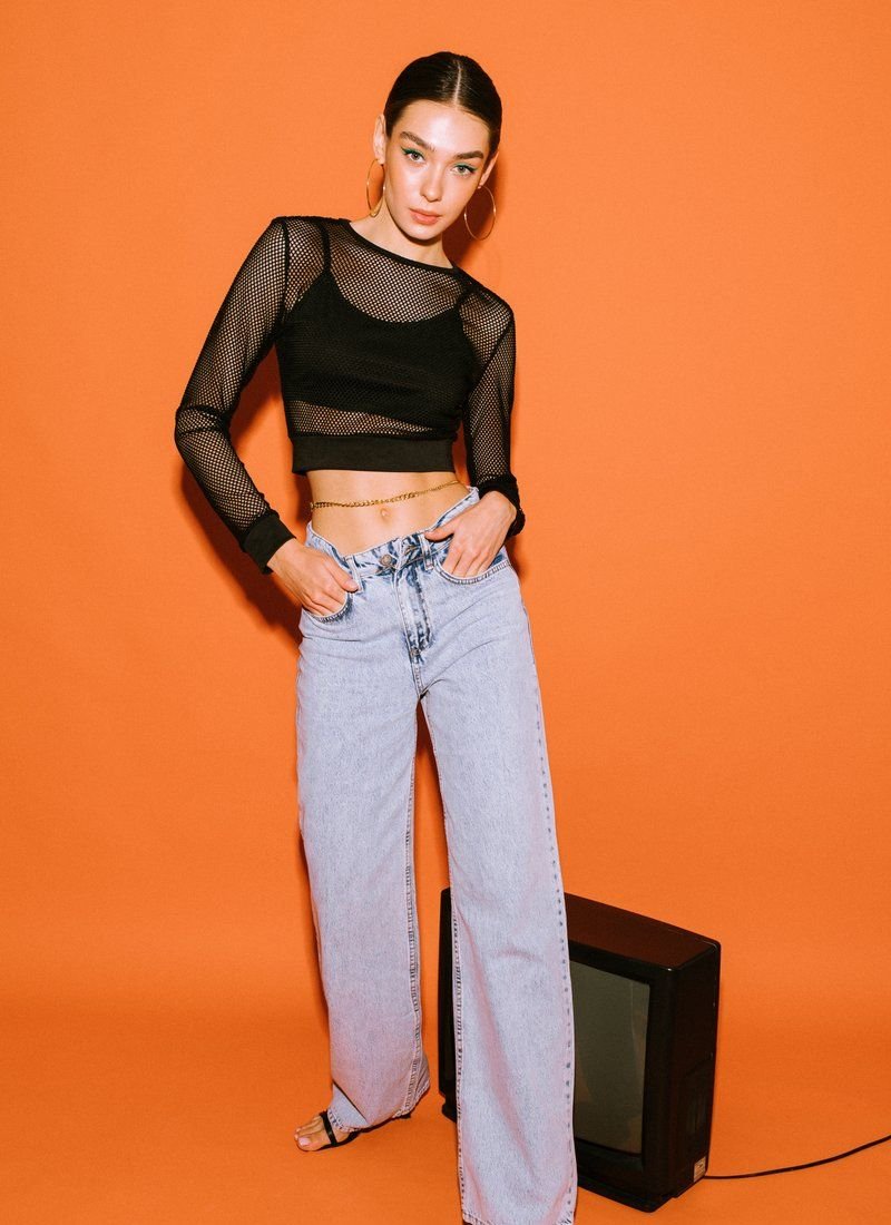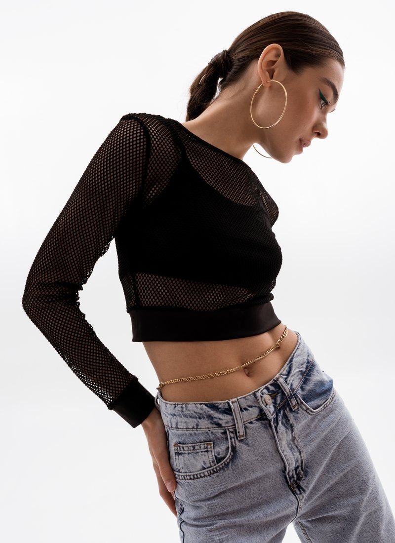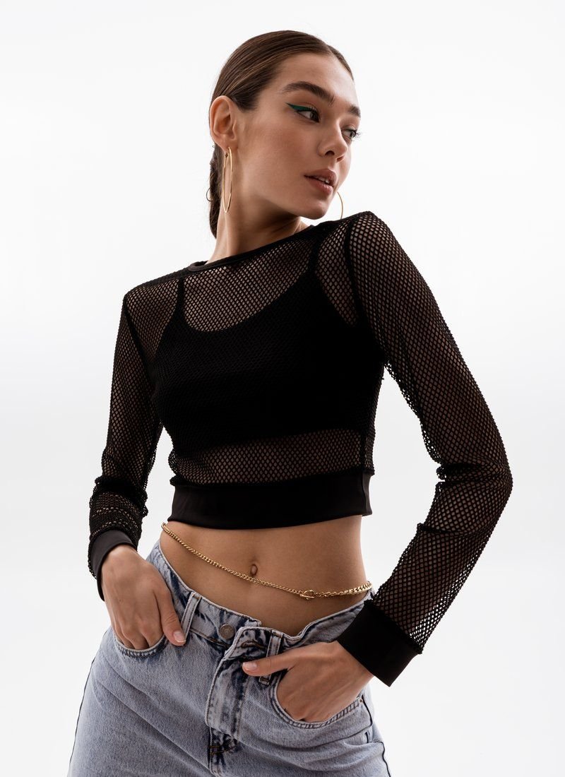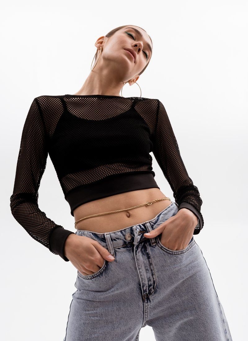 A shortened longsleeve in the grid adds provocation to the image. A removable top with thin straps acts as a lining.
