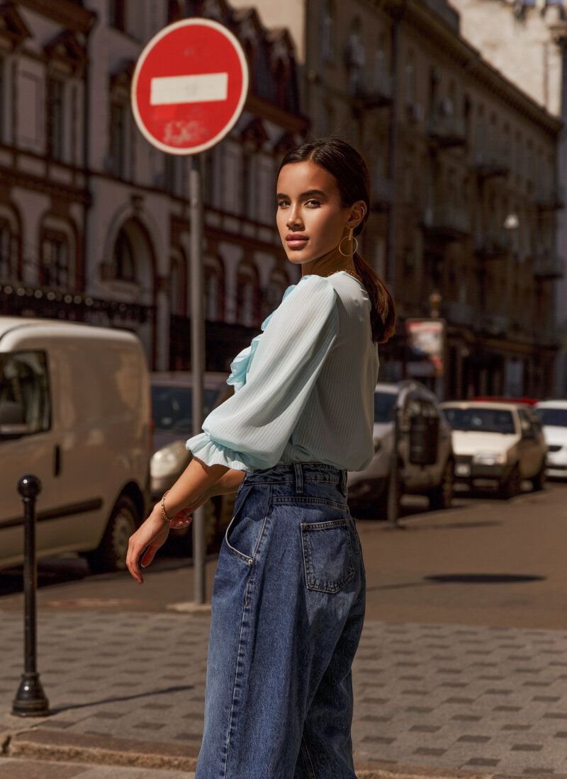 Airy blouse in blue with trendy voluminous sleeves. The front of the blouse is decorated with double ruffles to match. The 3/4 voluminous sleeve has an elastic insert and ruffles. There is a small teardrop-shaped neckline at the back, complemented by a button closure.