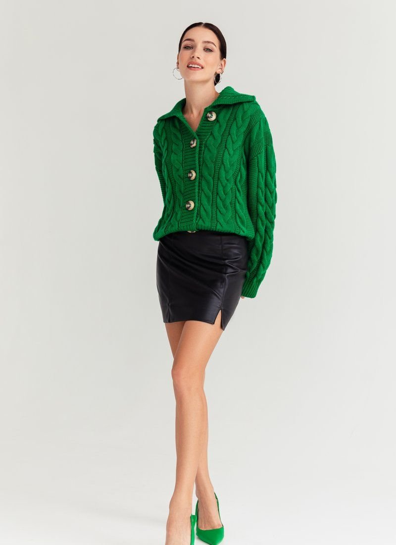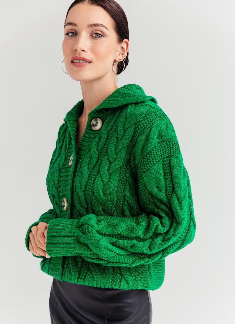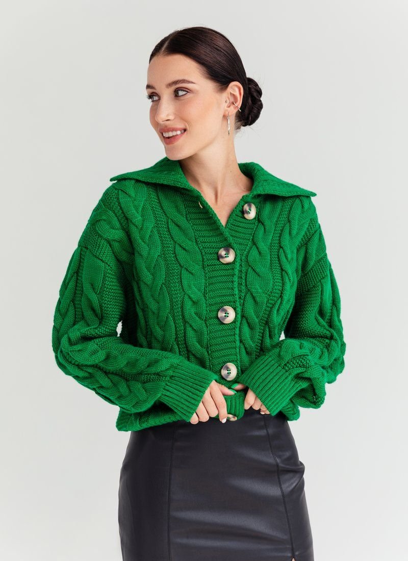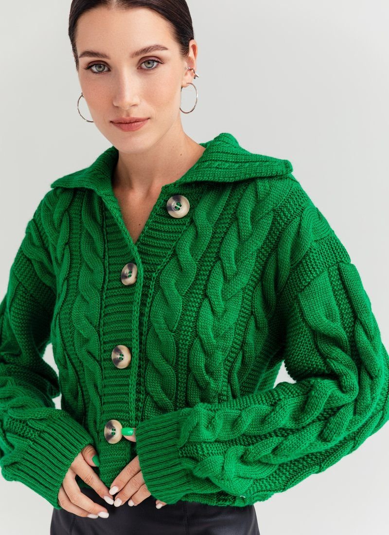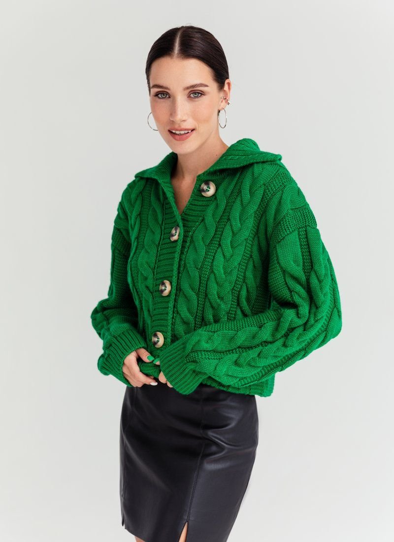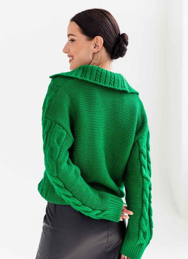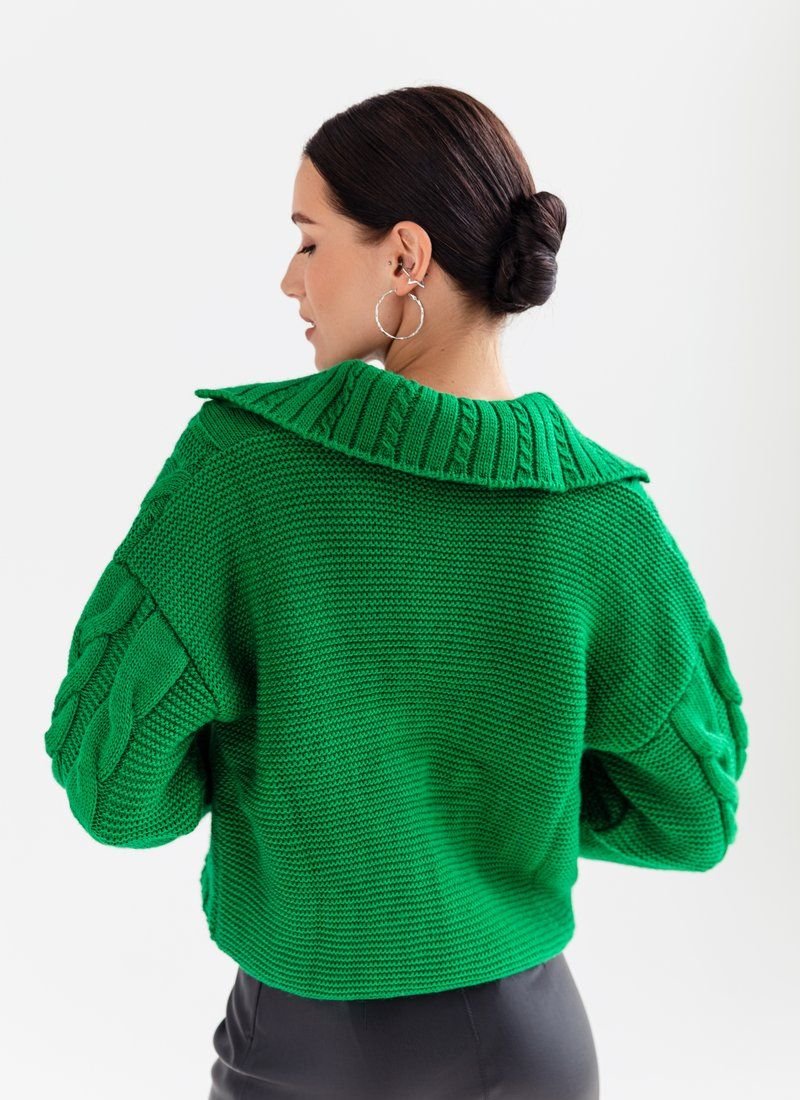 Green wool jumper with buttons. The jumper is decorated with a knitted pigtail, as well as a large collar. This model can be worn as an independent thing, or over tops or shirts.