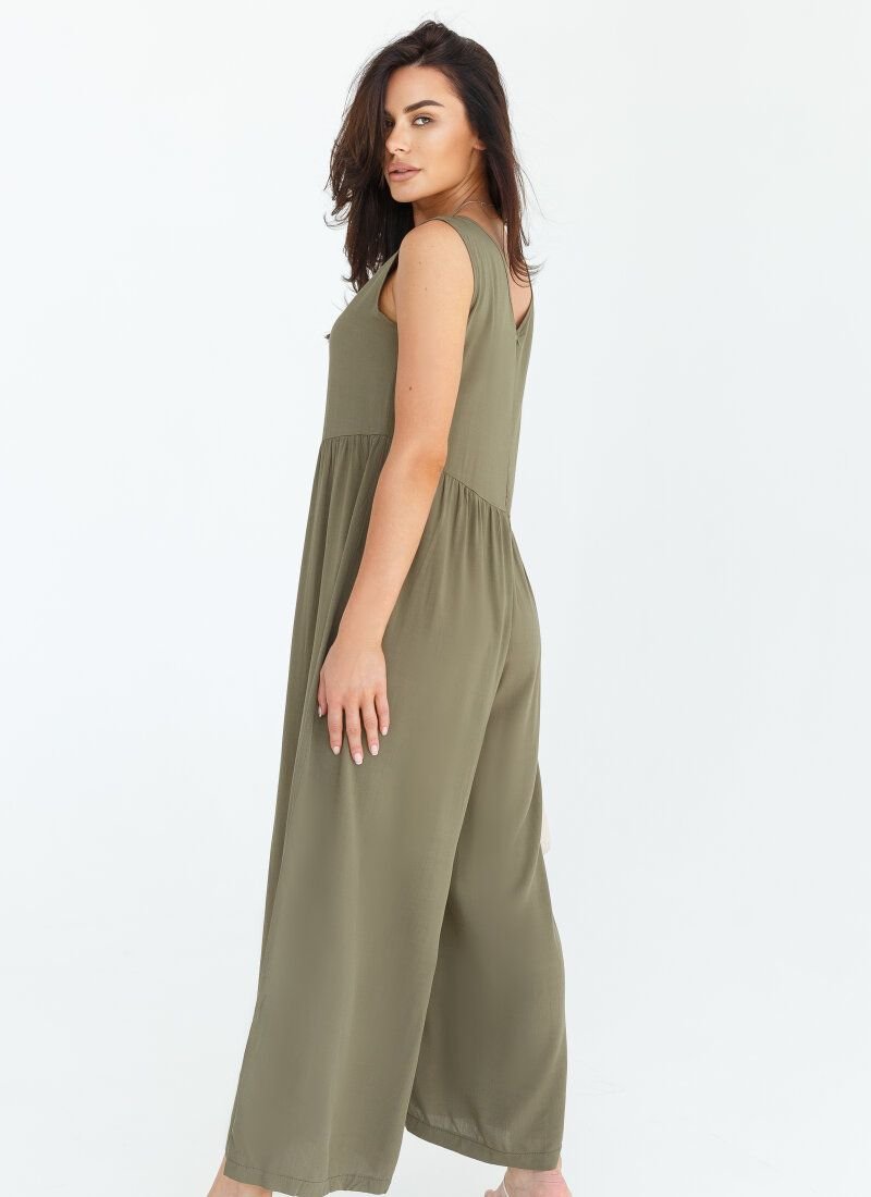 Khaki jumpsuit made of light cotton. Cropped wide trousers create a flying silhouette. The top of the jumpsuit opens the shoulder line. A cut-off waist with asymmetry adds originality to the model.