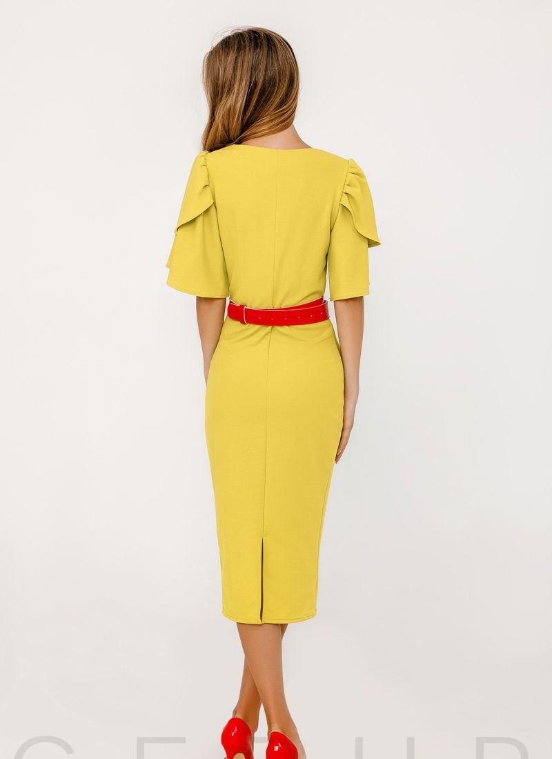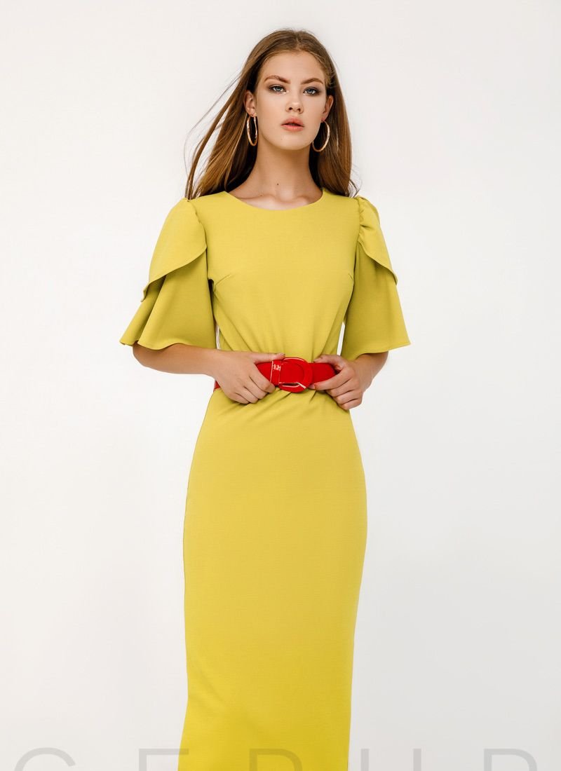 A bright fitted midi dress with a round neck, wing sleeves, a slit in the back, complemented by a contrasting eco-leather belt. Please note that the belt has changed (see additional photos from 24.06).