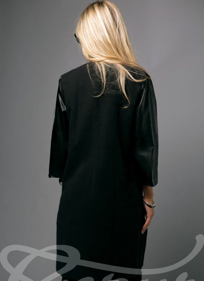 An original women's coat made of dense eco-cashmere: a laconic round neck, a loose sleeve made of contrasting eco-leather and two small pockets on the sides.
