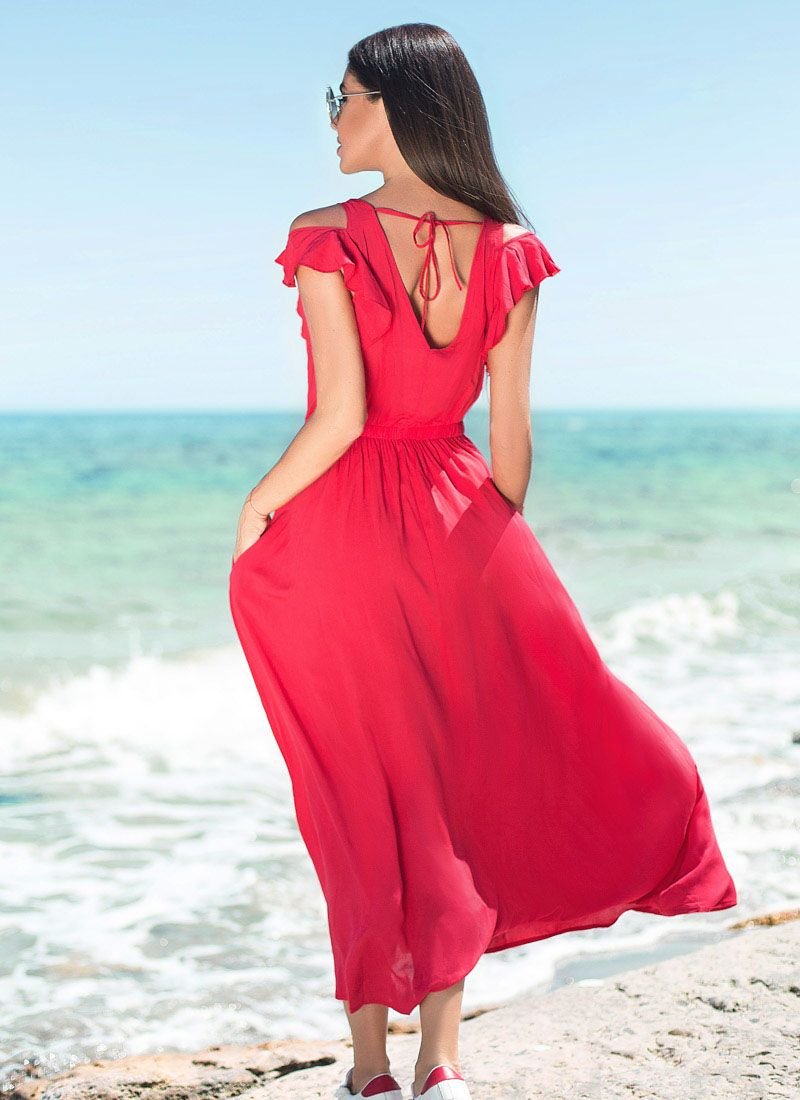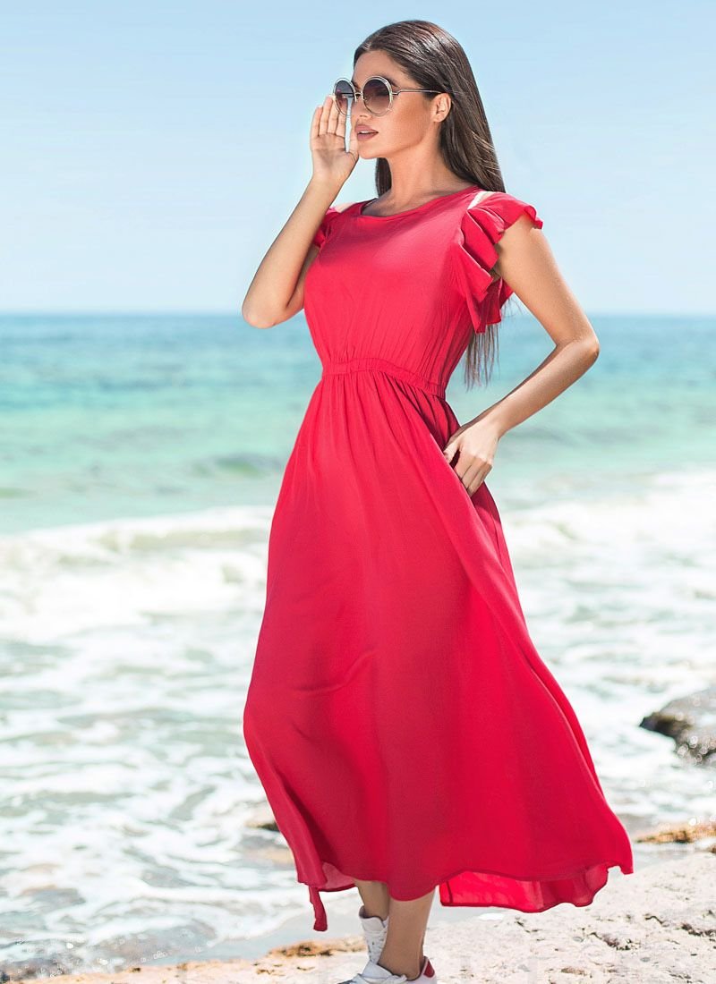 A long summer sundress made of light flowing fabric: small slits on the shoulders, wing sleeves, an elastic insert at the waist and a cutout on the back, complemented by ties.