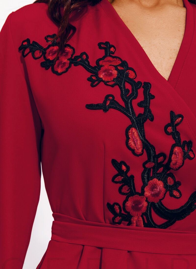 Trendy business-style suit: a sophisticated red smelling blouse with long sleeves, ties, a peplum and contrasting floral ornament, straight-cut trousers, medium fit with an elastic insert at the waist and two welt pockets.